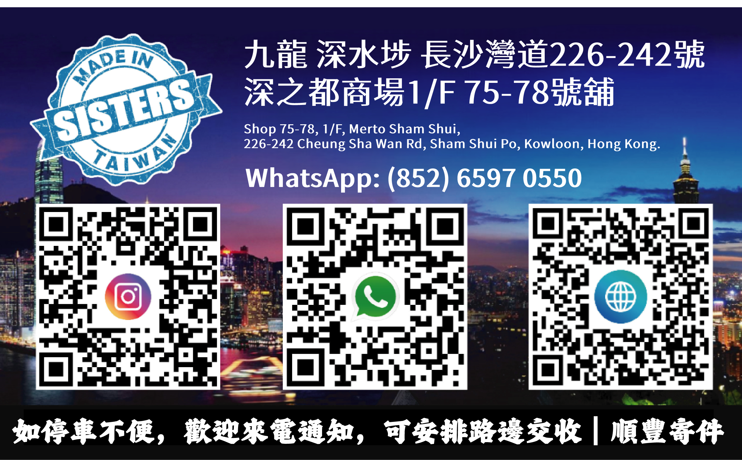(商品相關及常見問題)營業時間為何?深水埗長沙灣道226-242號深之都商場 1/F, 75 - 78 號舖營業時間:星期一 - 星期日 13:00 - 20:00Whatsapp:6597-0550接受哪些付款方式?本店接受的付款方式目前有現金交易、轉數快、八達通、ATM轉帳及線上付款(Paypal)請問商品庫存、尺寸、價格、是否販售、何時進貨等?商品實際數量、尺寸、價格、是否販售及進貨時間等因銷售速度不盡相同,必須以現場陳列為準。E-mail: Sisterstw2016@gmail.com