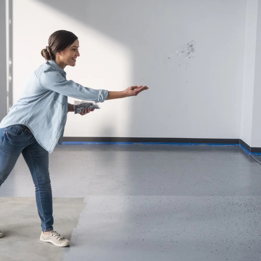 視情況可搭配遮蓋膠遮蓋牆面邊緣處。搭配油漆盤與高品質的滾筒刷是必要的。建議分成數個區域(建議以半坪為單位)塗刷,並且在每個區域塗刷後灑上花紋色片。