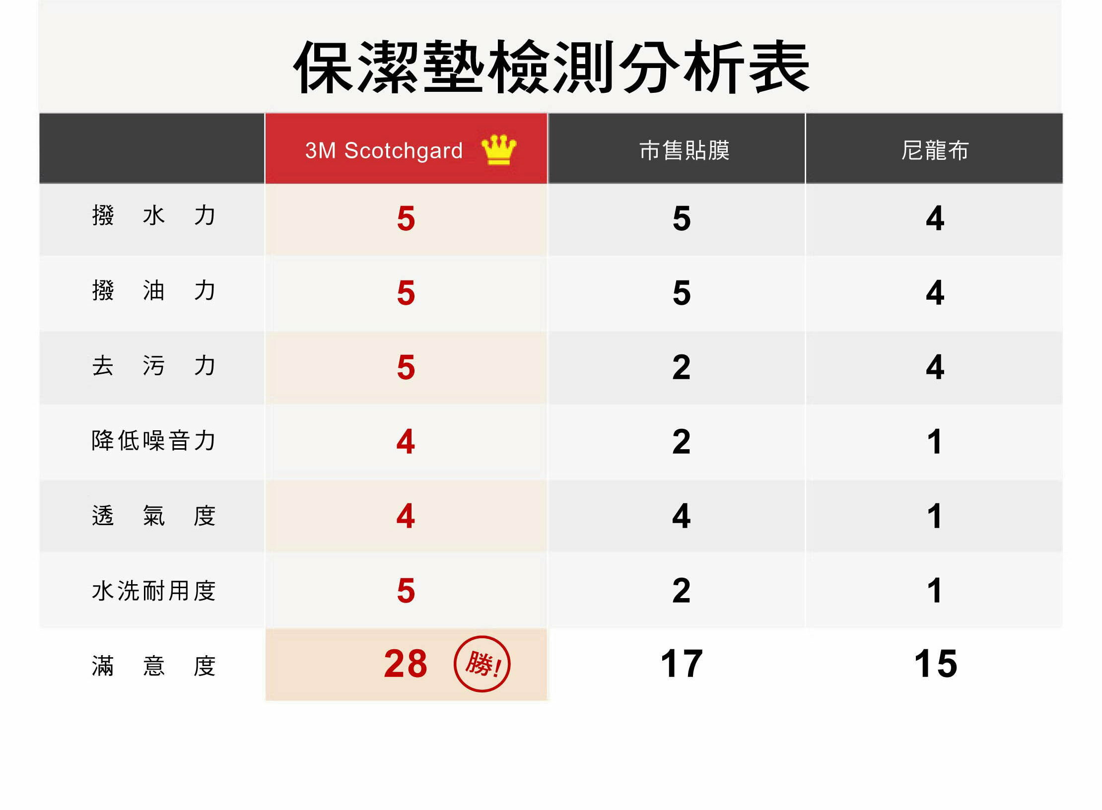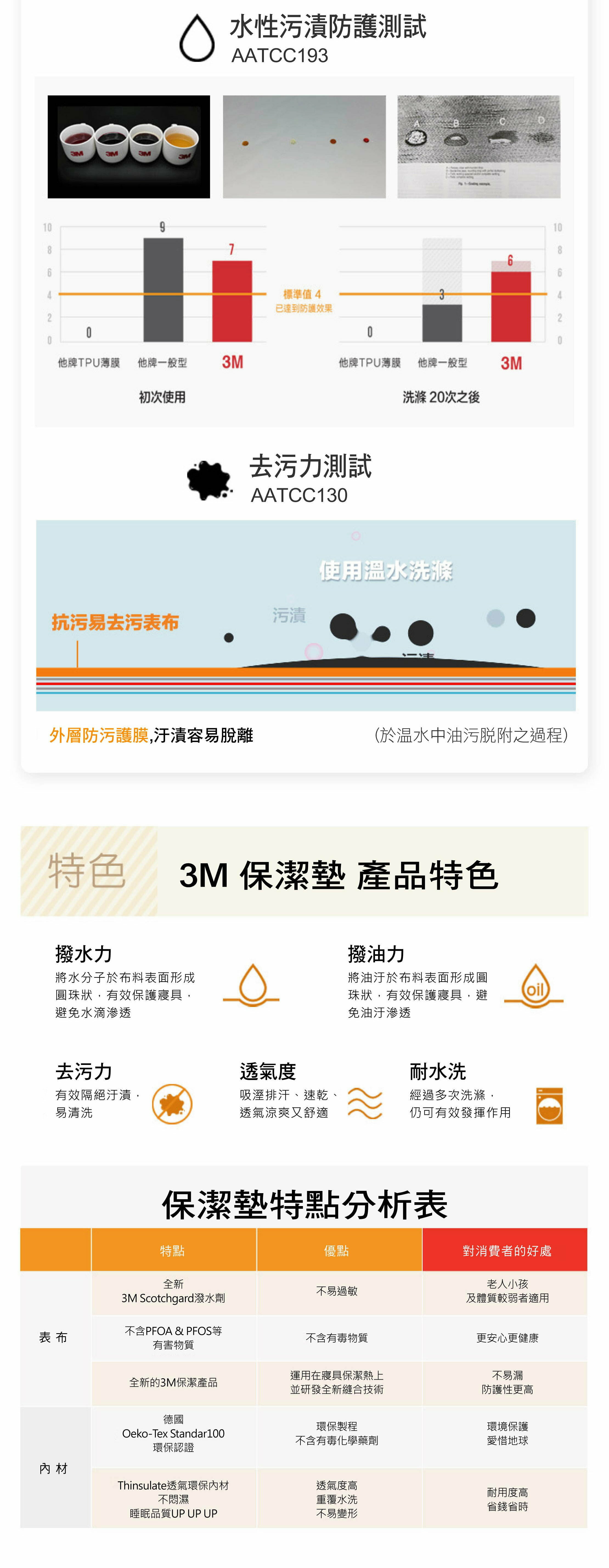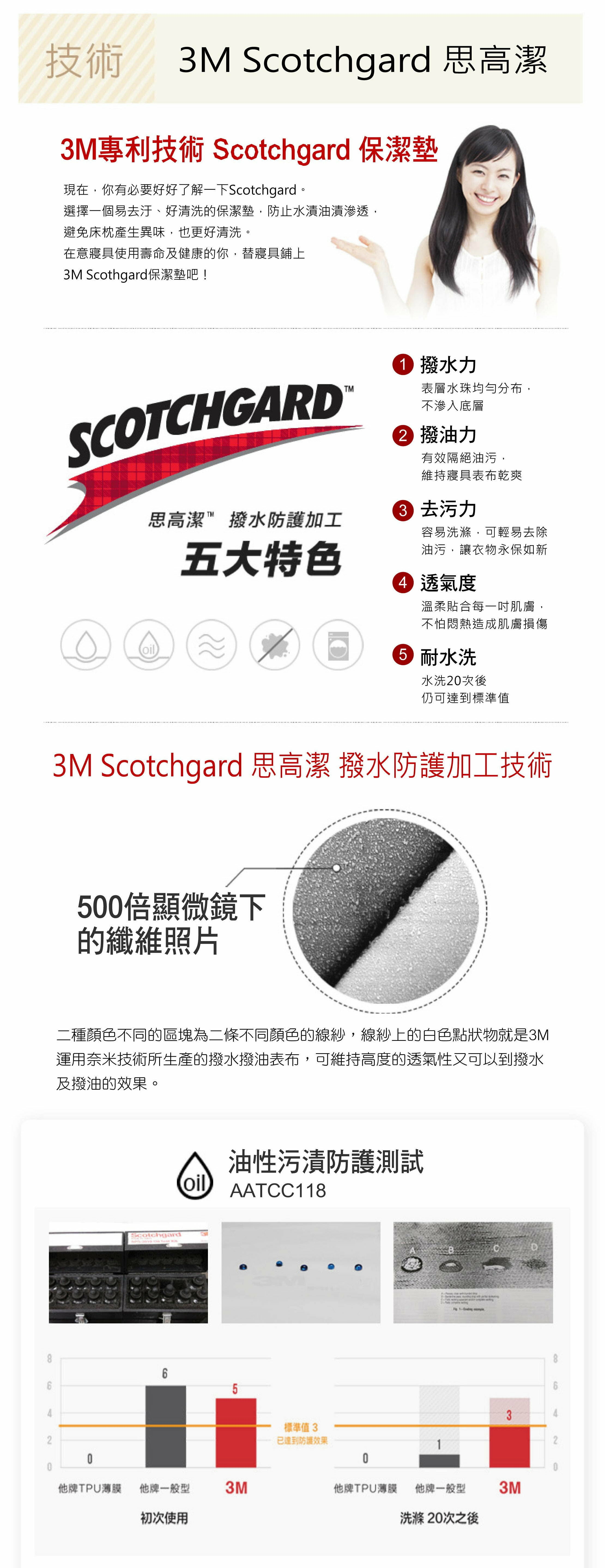 優異的潑水潑油特性,儘管不慎傾倒飲料或小孩漏尿,可以有效阻隔液體滲入,減少床墊的污 損