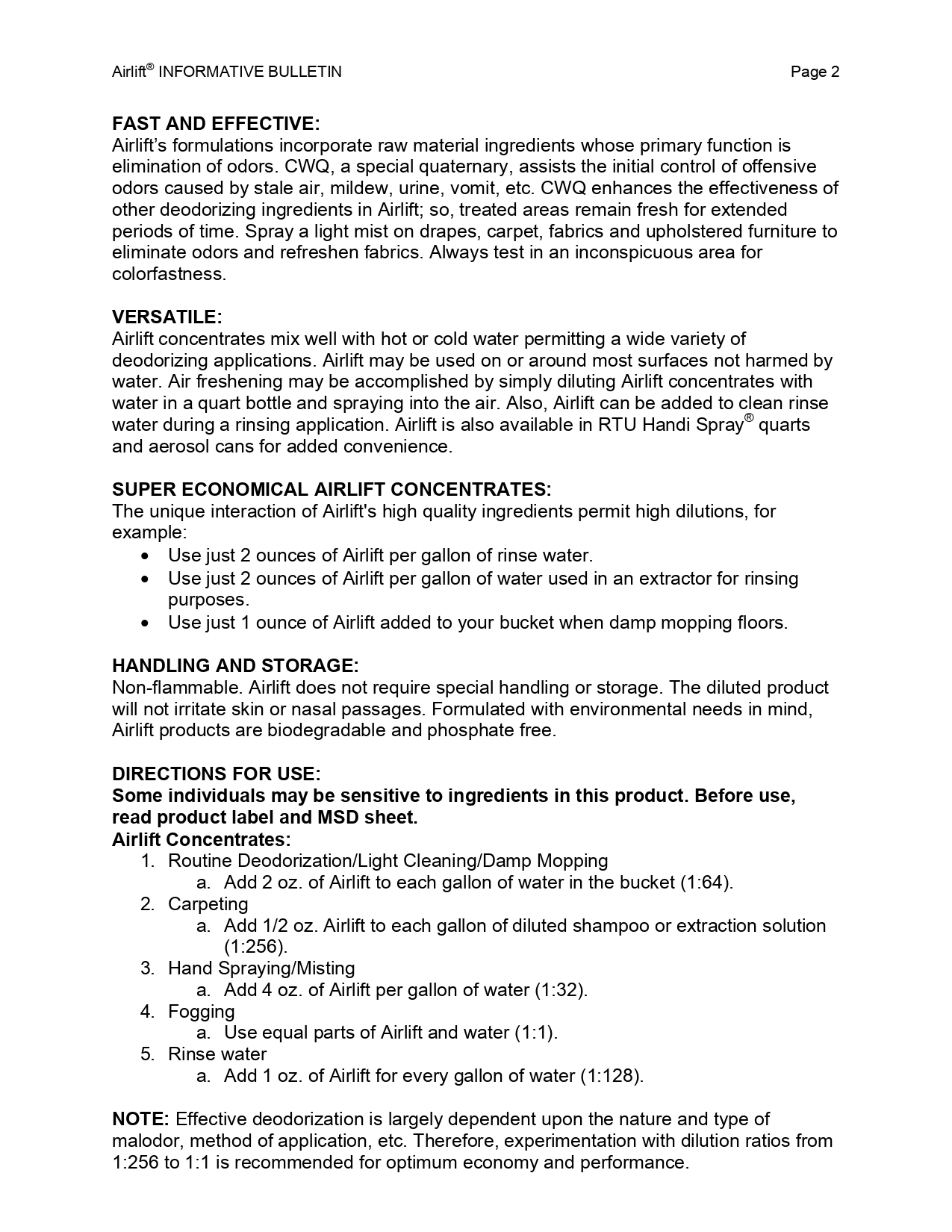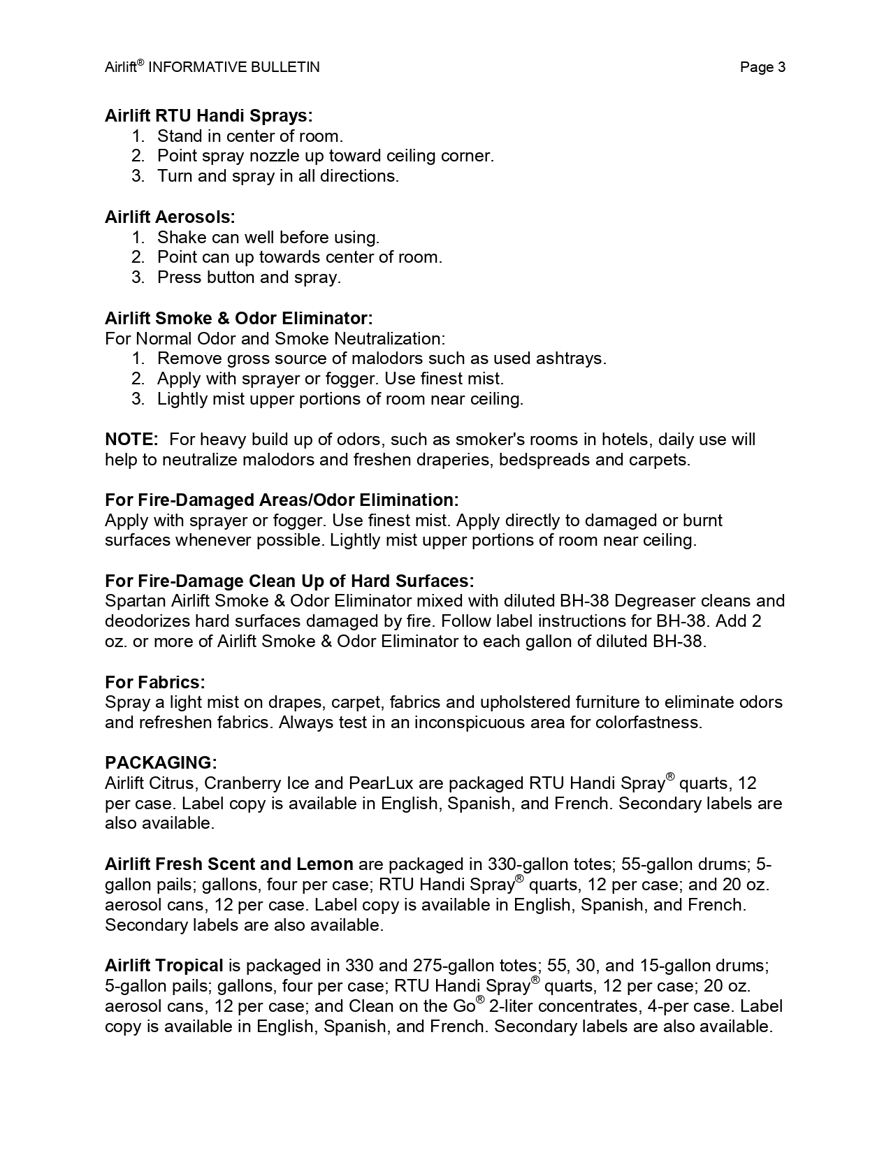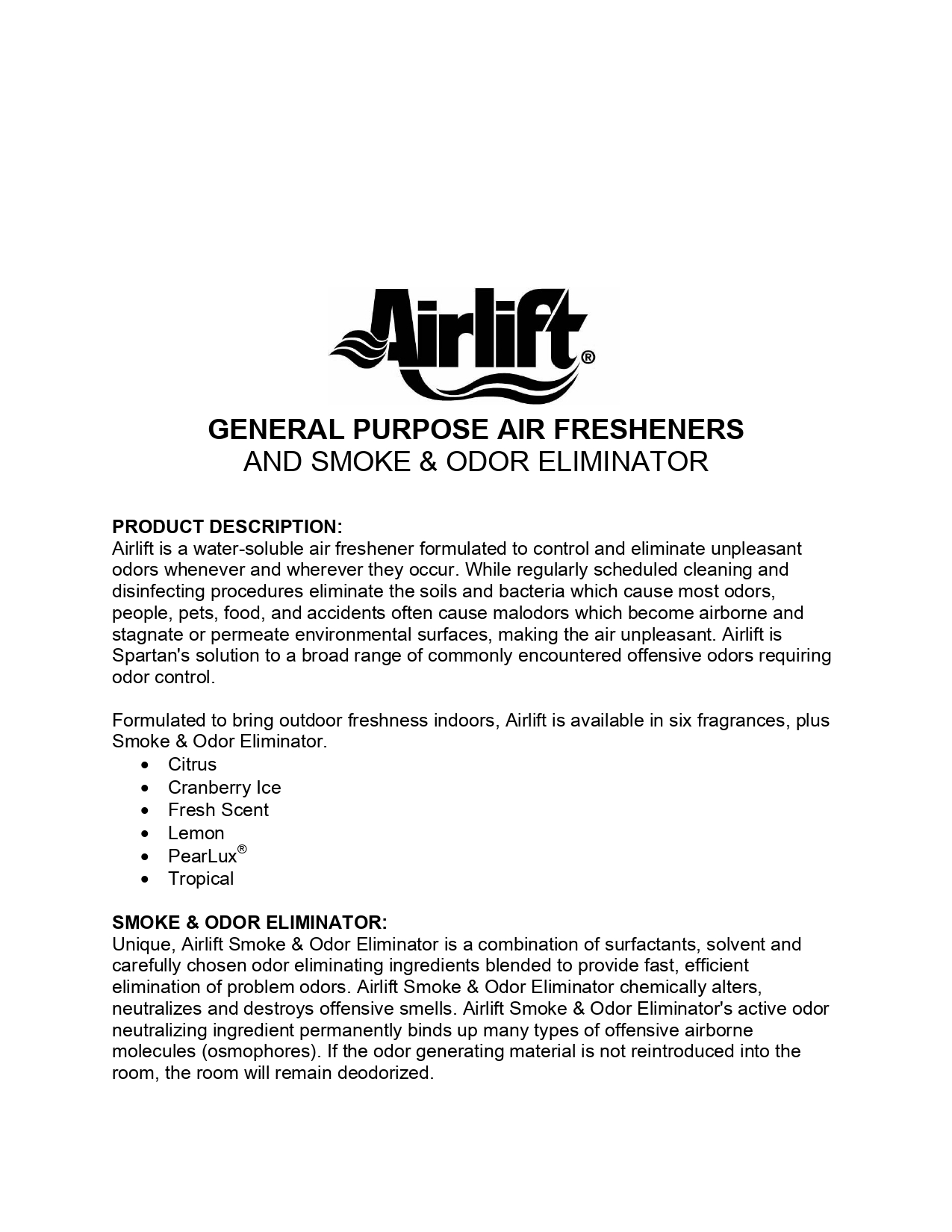 Airlift是一種環保水性空氣清新劑和除臭劑,成份中的活性氣味分解劑能破壞空氣中所傳播的惡臭微粒(例如人體、寵物、食物、煙酒、尿液、糞便產生惡臭),中和及破壞每一個有害的臭味,保留一種宜人的清淨香味。美國USDA產品安全檢驗局認證,不含磷酸鹽及壬基酚,生物可分解。