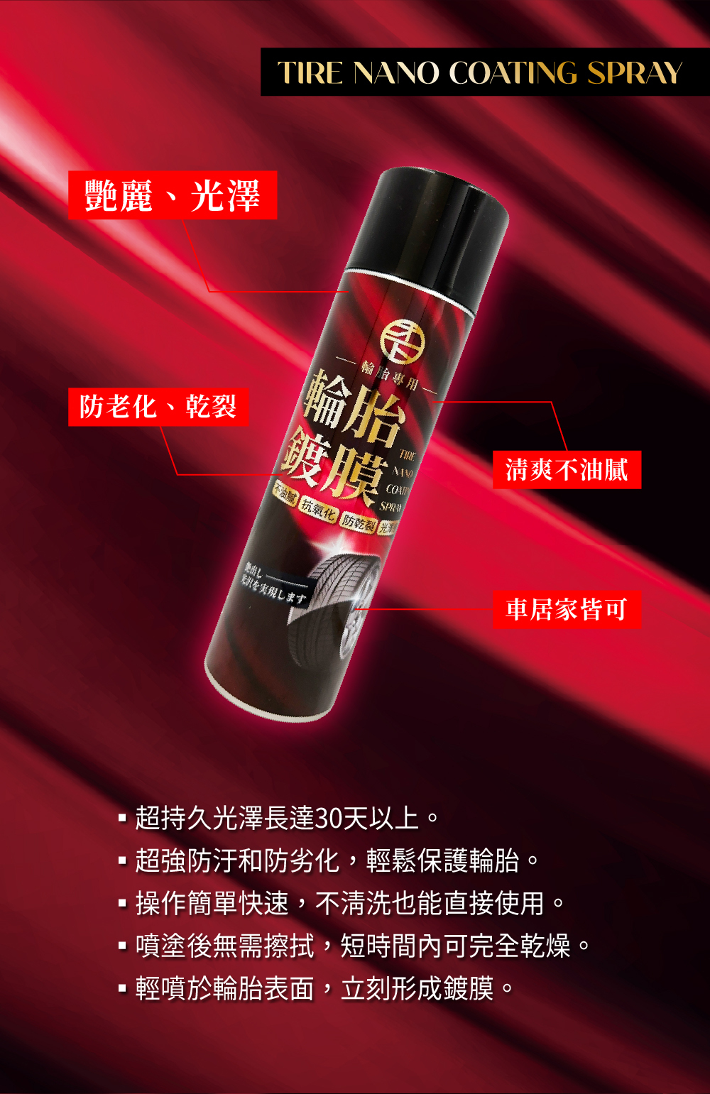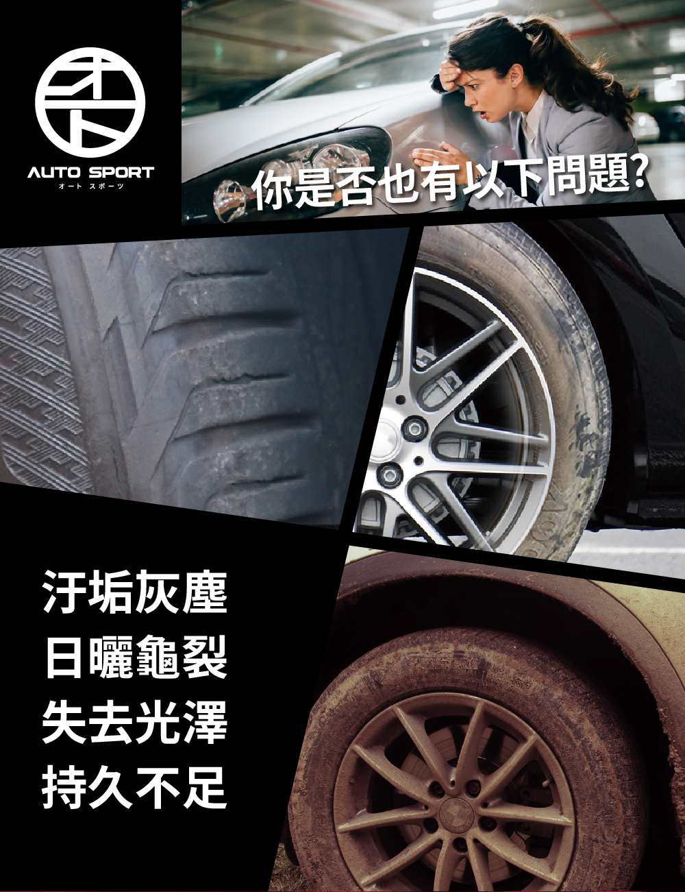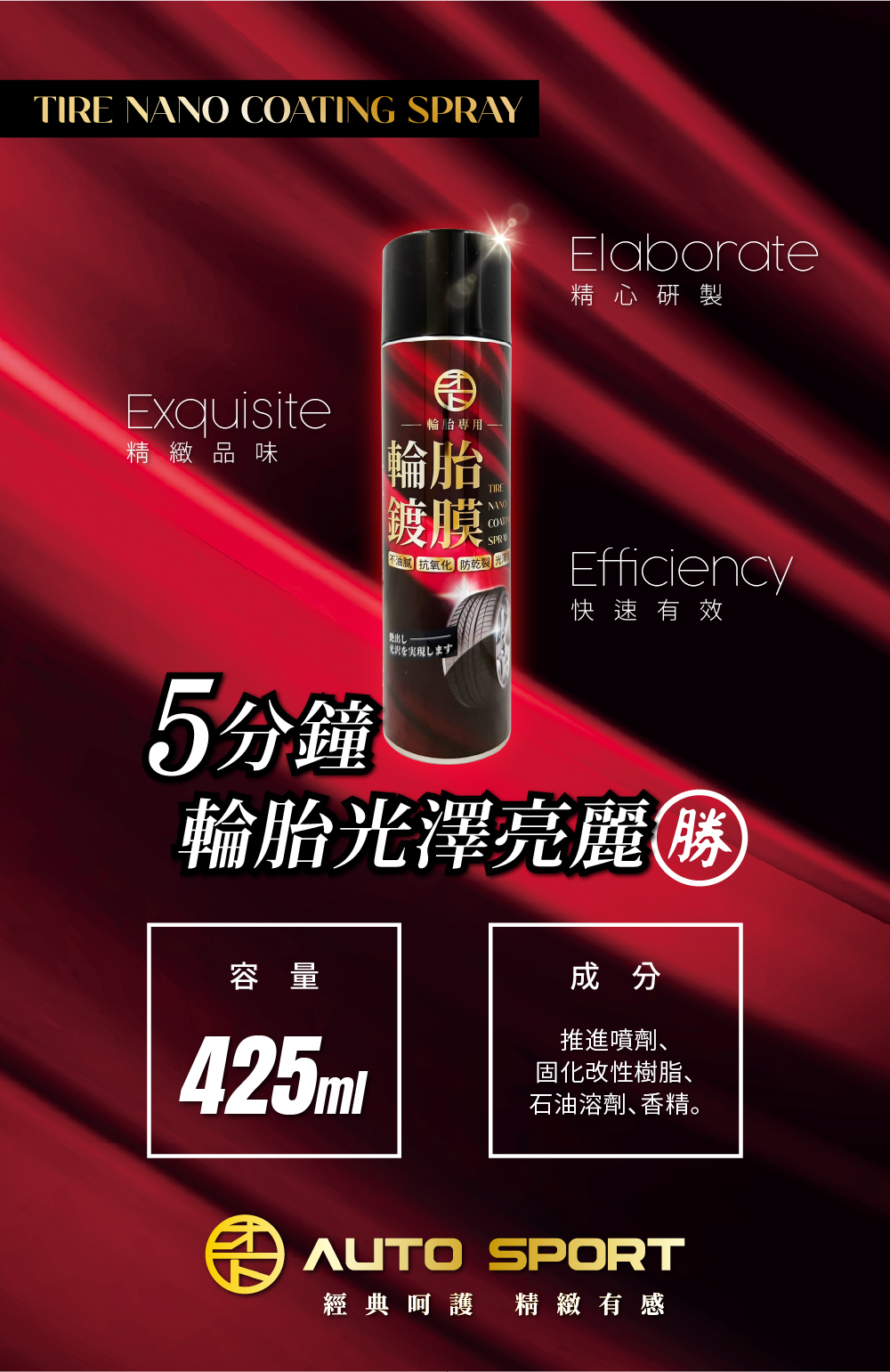 Auto Sport輪胎炫黑鍍膜噴霧,效果持久,非油性不打滑不甩油,超強防污防裂,使用後即刻有烏黑光澤感,輕鬆保護輪胎。