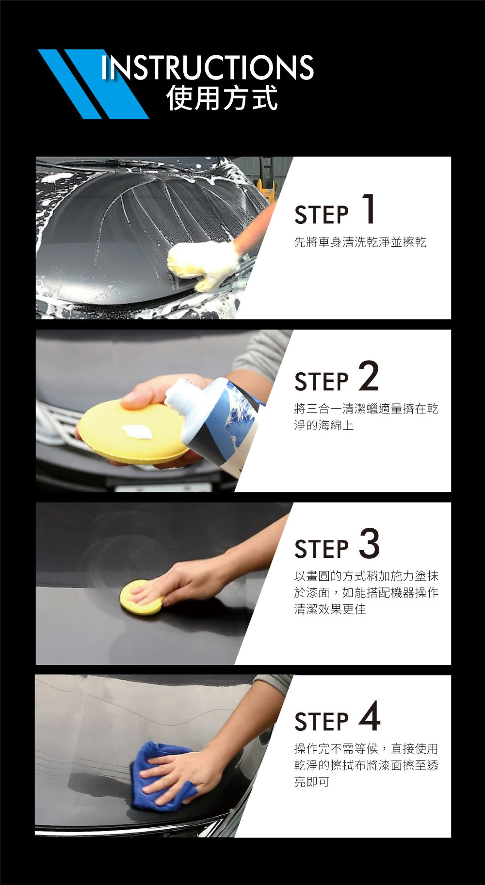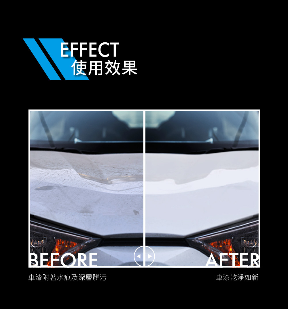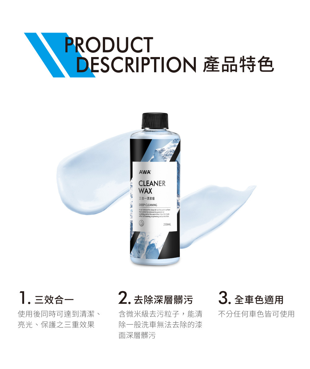 能清除一般洗車無法去除的髒污,同時達到清潔、亮光、保護三效合一的清潔蠟,不分任何車色皆可使用,效果顯著又安全,使用過後再搭配保護蠟,讓保護蠟效果更加倍。