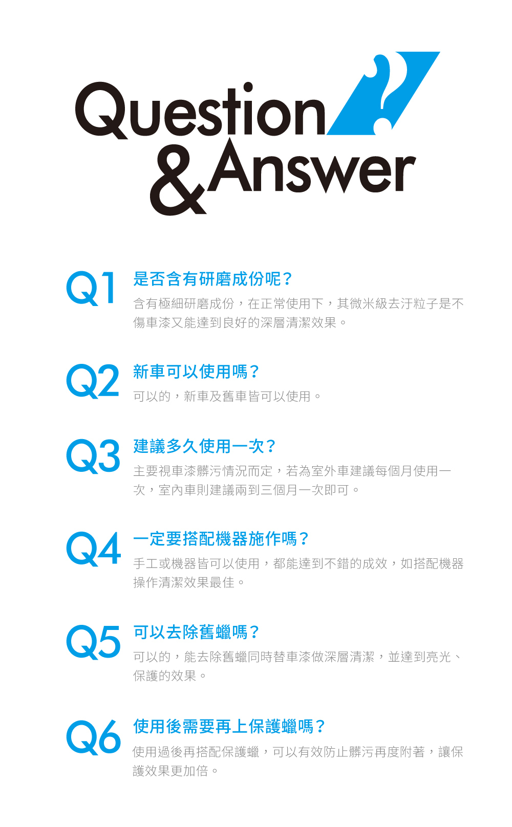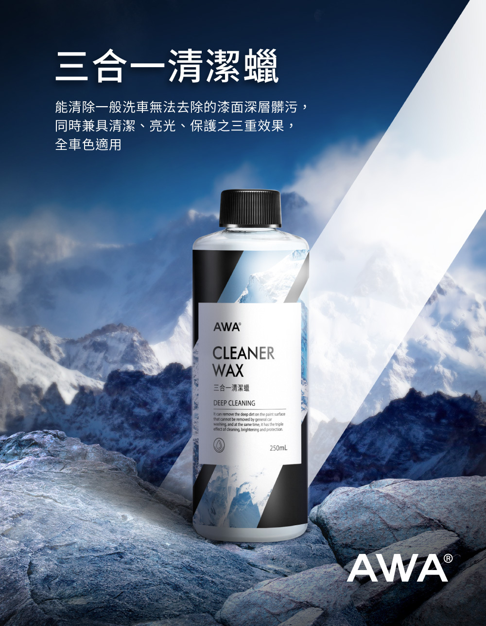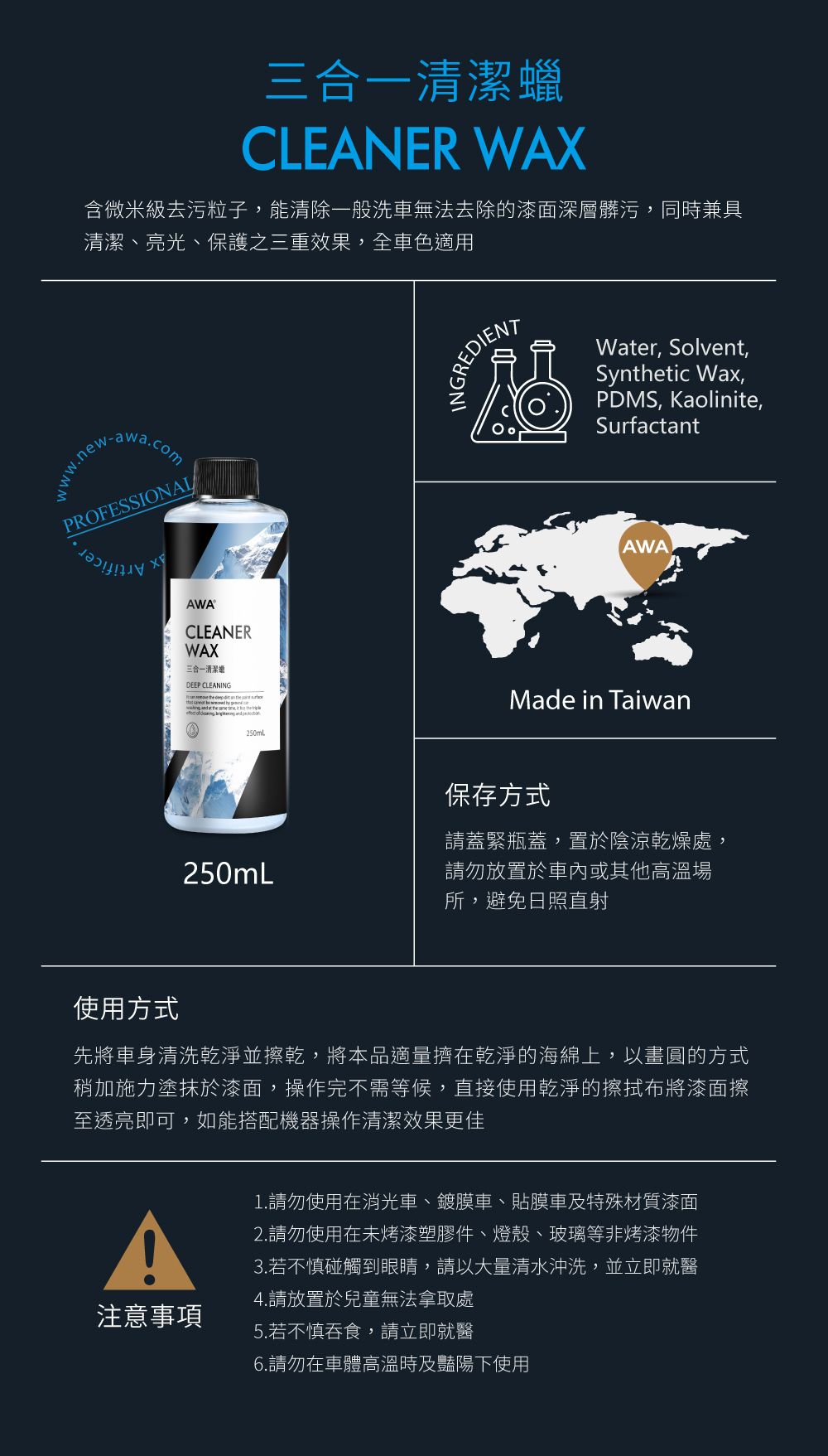 能清除一般洗車無法去除的髒污,同時達到清潔、亮光、保護三效合一的清潔蠟,不分任何車色皆可使用,效果顯著又安全,使用過後再搭配保護蠟,讓保護蠟效果更加倍。