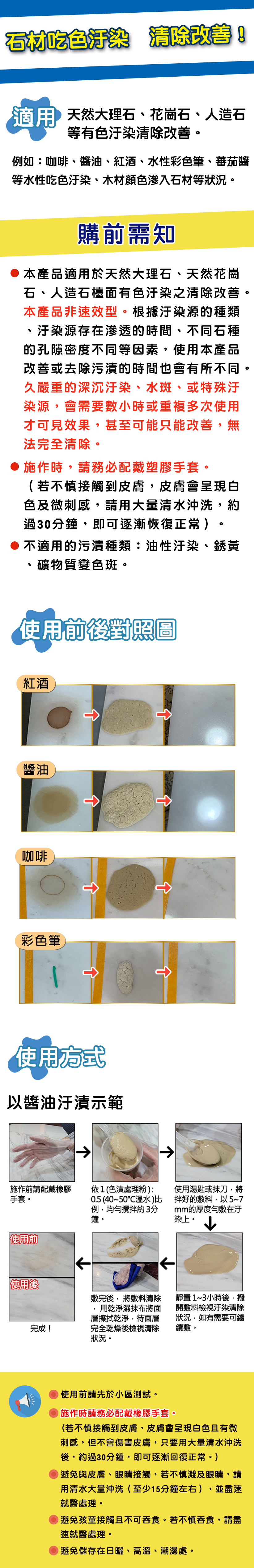適用天然大理石、天然花崗石、人造石檯面有色汙染之清除改善