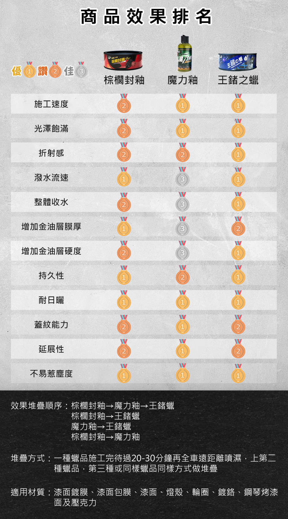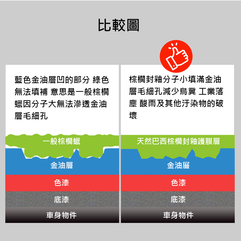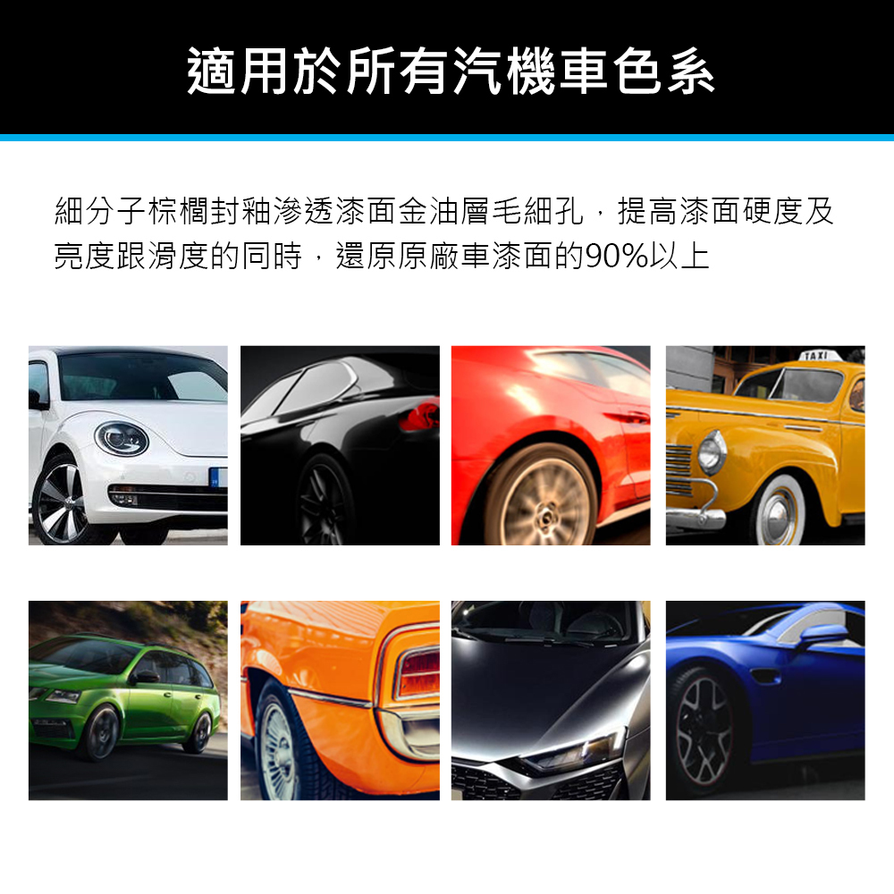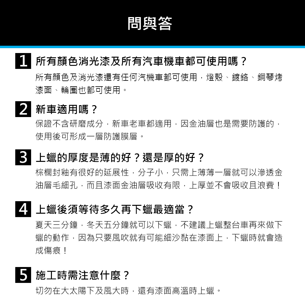 棕櫚封釉:商品適用在漆面、燈殼、鍍鉻、鋼琴烤漆面、輪圈及完全平面的塑膠材質,若塑膠材質有微小的凹凸面或花紋就不可使用,則會造成白化現象!