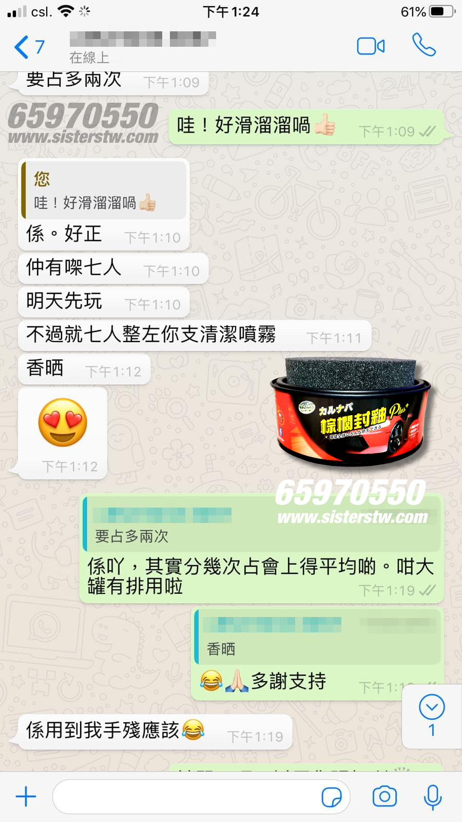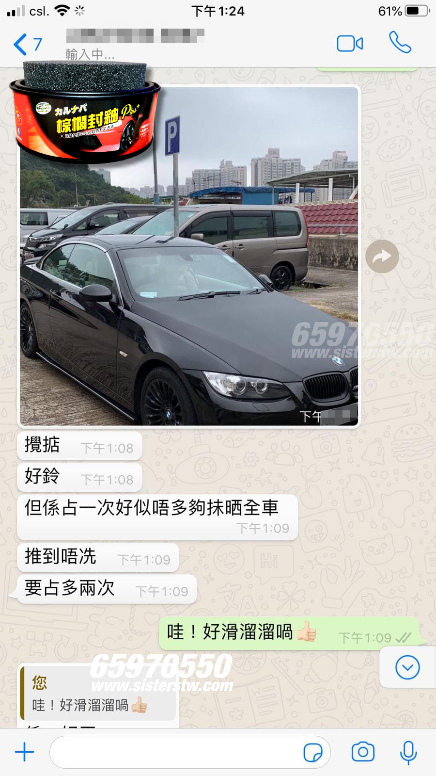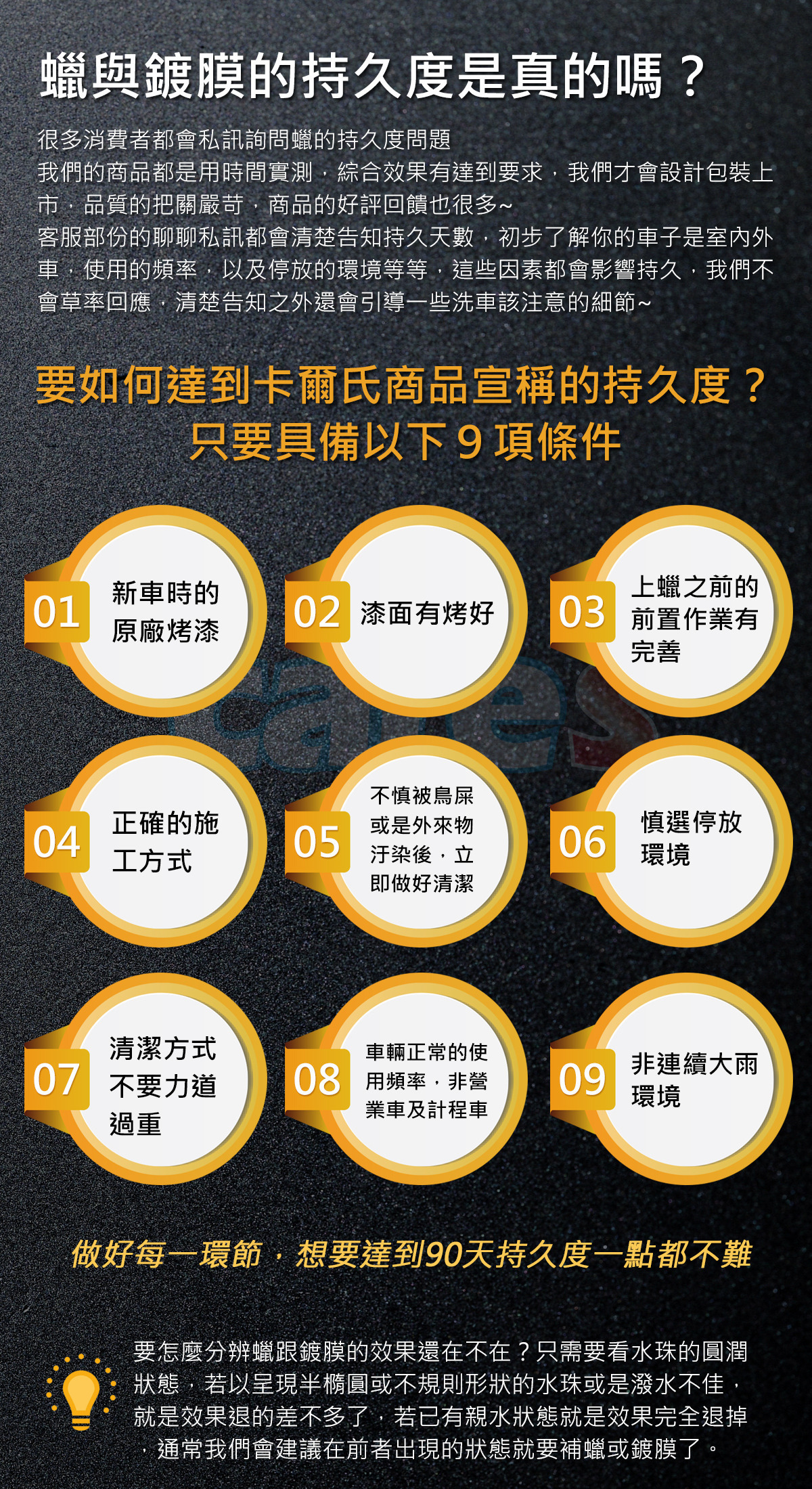 棕櫚封釉:商品適用在漆面、燈殼、鍍鉻、鋼琴烤漆面、輪圈及完全平面的塑膠材質,若塑膠材質有微小的凹凸面或花紋就不可使用,則會造成白化現象!