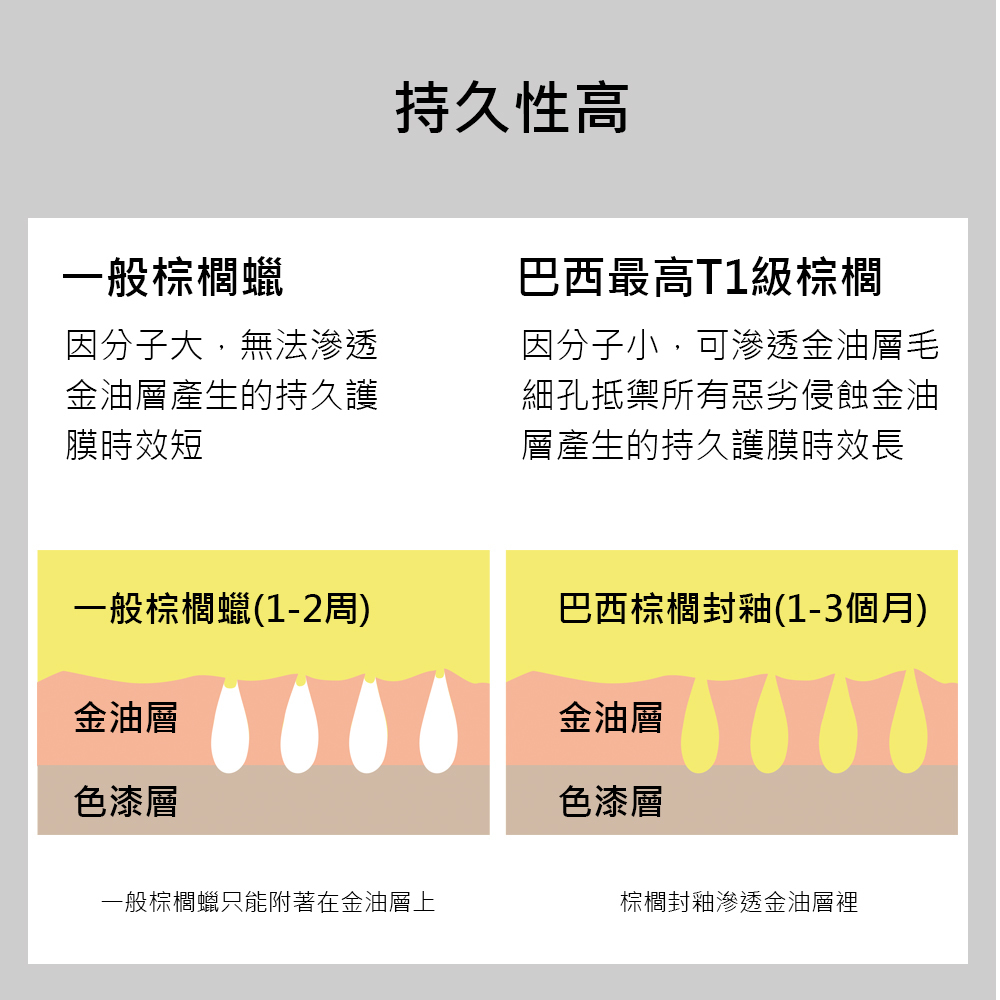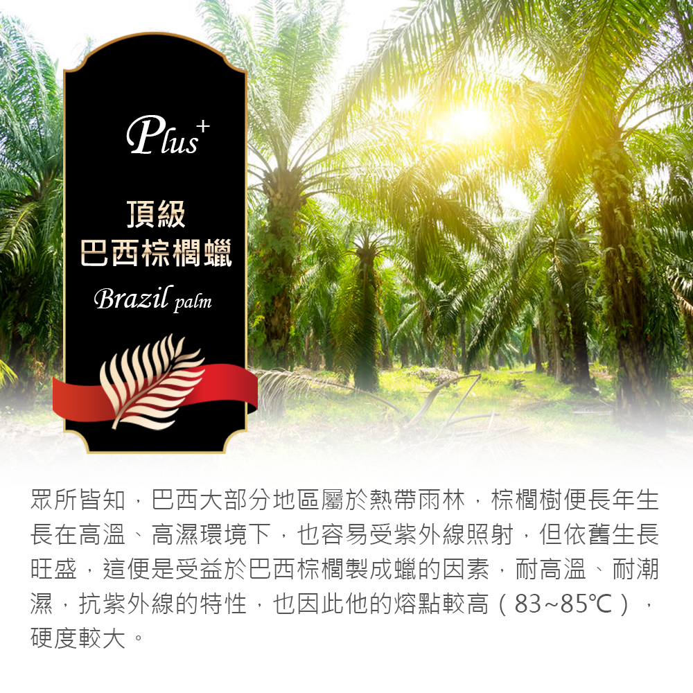 100%採用巴西最高T1級棕櫚直接導入金油層深層~ 提供最高亮度及防護。