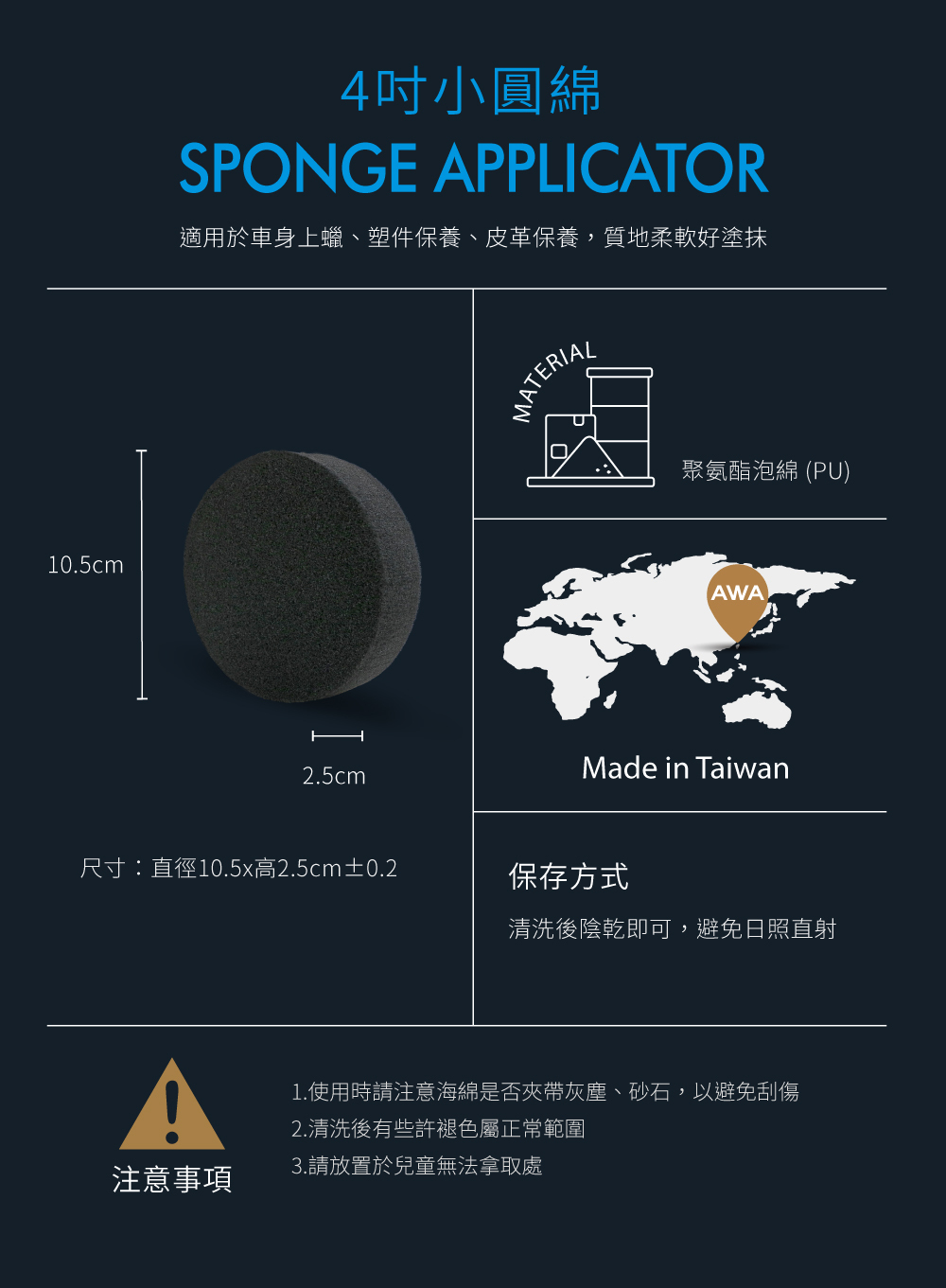 高密度海綿製成,綿體柔軟不刮傷烤漆,有別於一般市售海綿,此款海綿經久耐用不易破裂,適合洗車或手工上蠟或手工上油使用