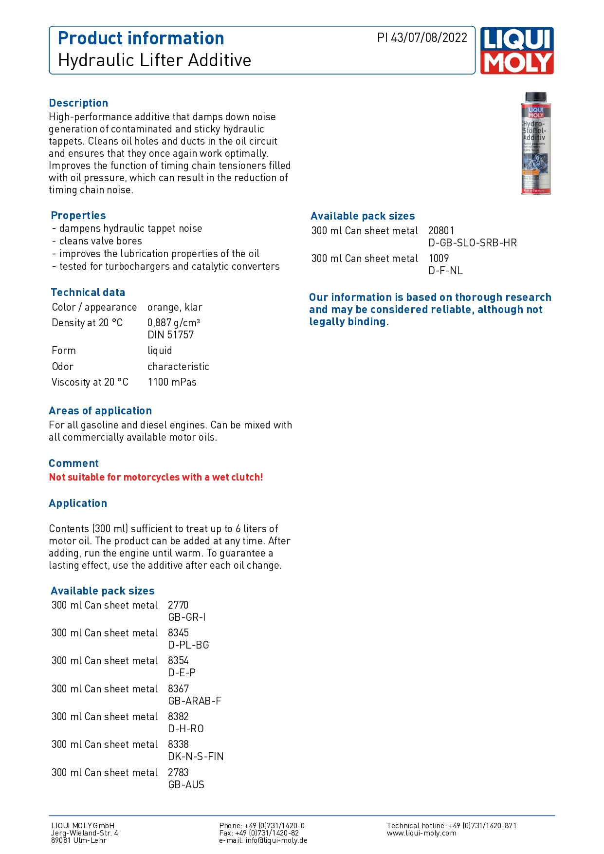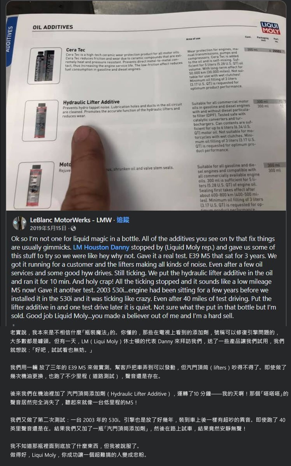 本產品為一款高性能的添加劑,可提供潤滑並抑制磨損之後的汽門頂筒發出的噪音。能清潔閥孔並防止引擎汽門頂筒的磨損。無論有無渦輪增壓裝置的汽柴油車輛皆可使用。