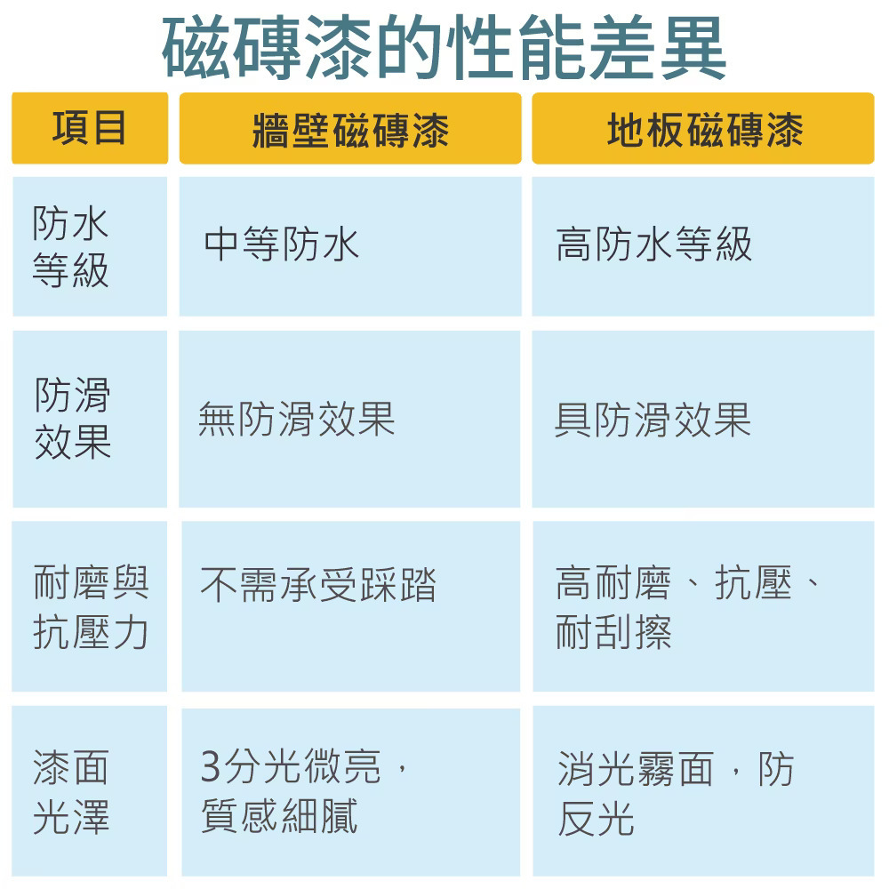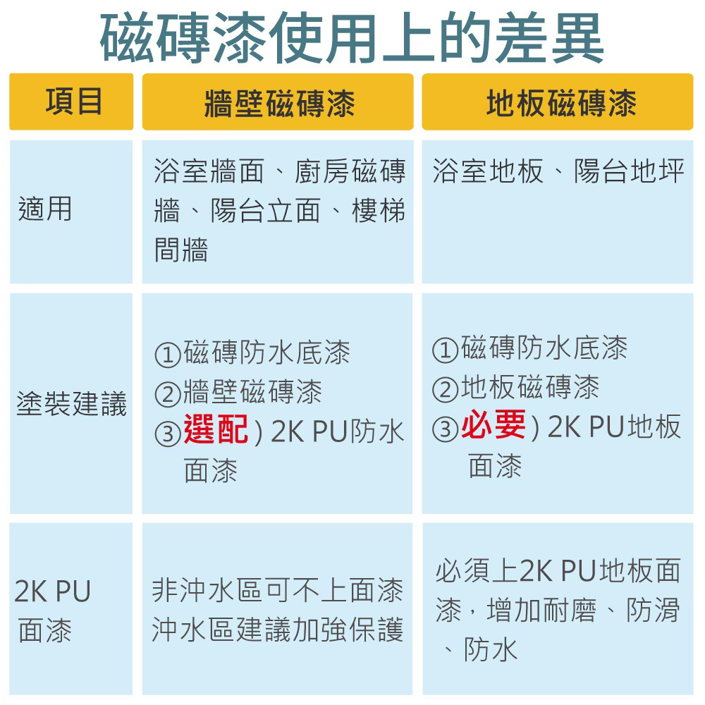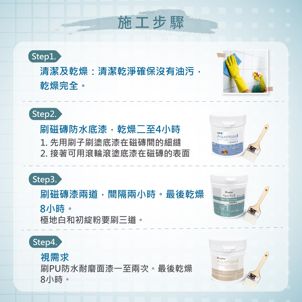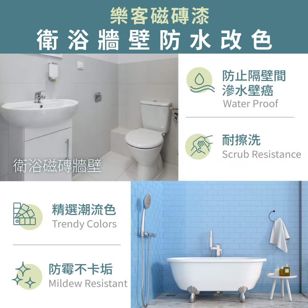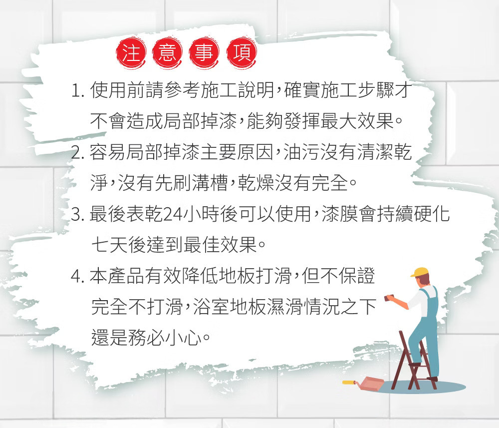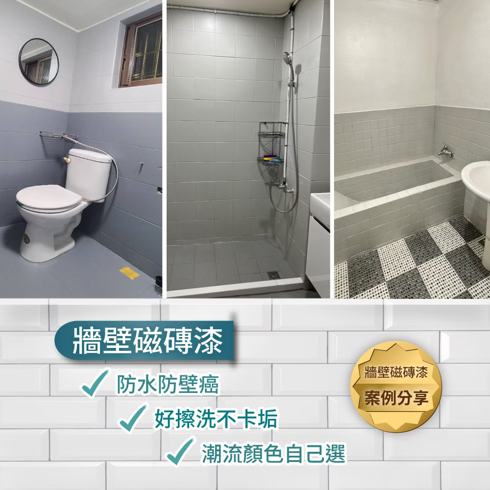 台灣製獨家磁磚底漆,可以加強色漆的附著力,改色後的磁磚不掉漆。適用於家居廁所、廚房、陽台、樓梯間等磁磚牆面。強效附著、遮蓋力佳,能輕鬆翻新舊磁磚外觀,打造乾淨清爽的新牆面。