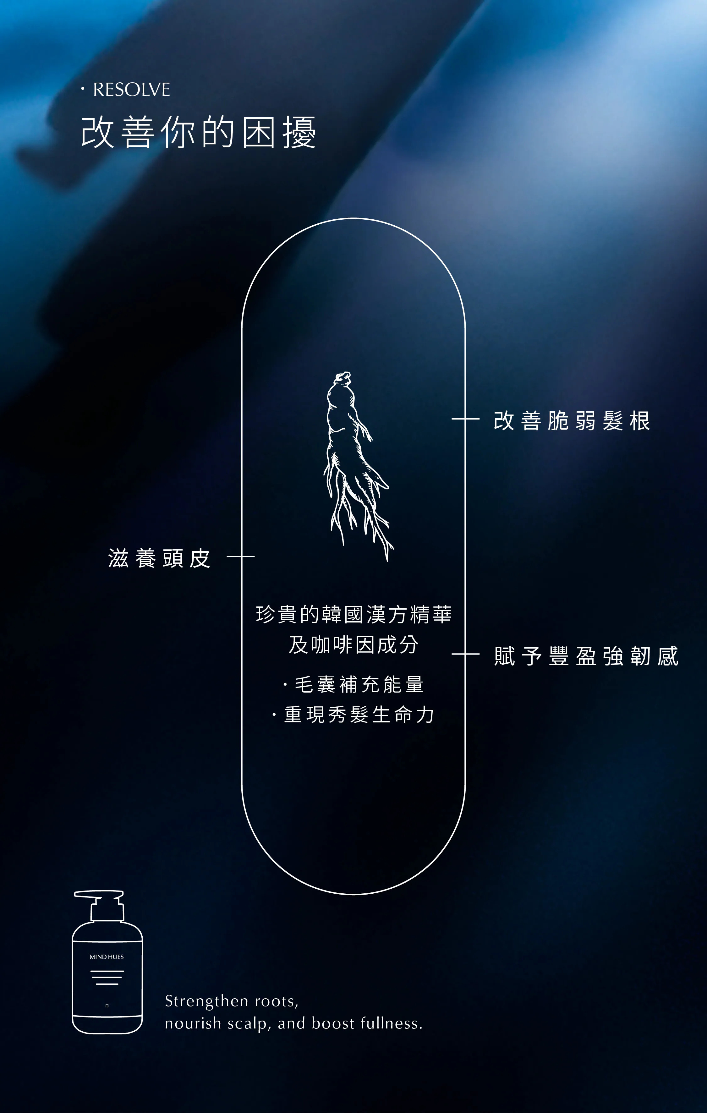擁有珍貴的人參、山藥、地黃等韓國漢方植萃精華,可滋養頭皮、強健髮根,同時以咖啡因成分為毛囊補充能量,重現秀髮生命力,展現青春光彩。