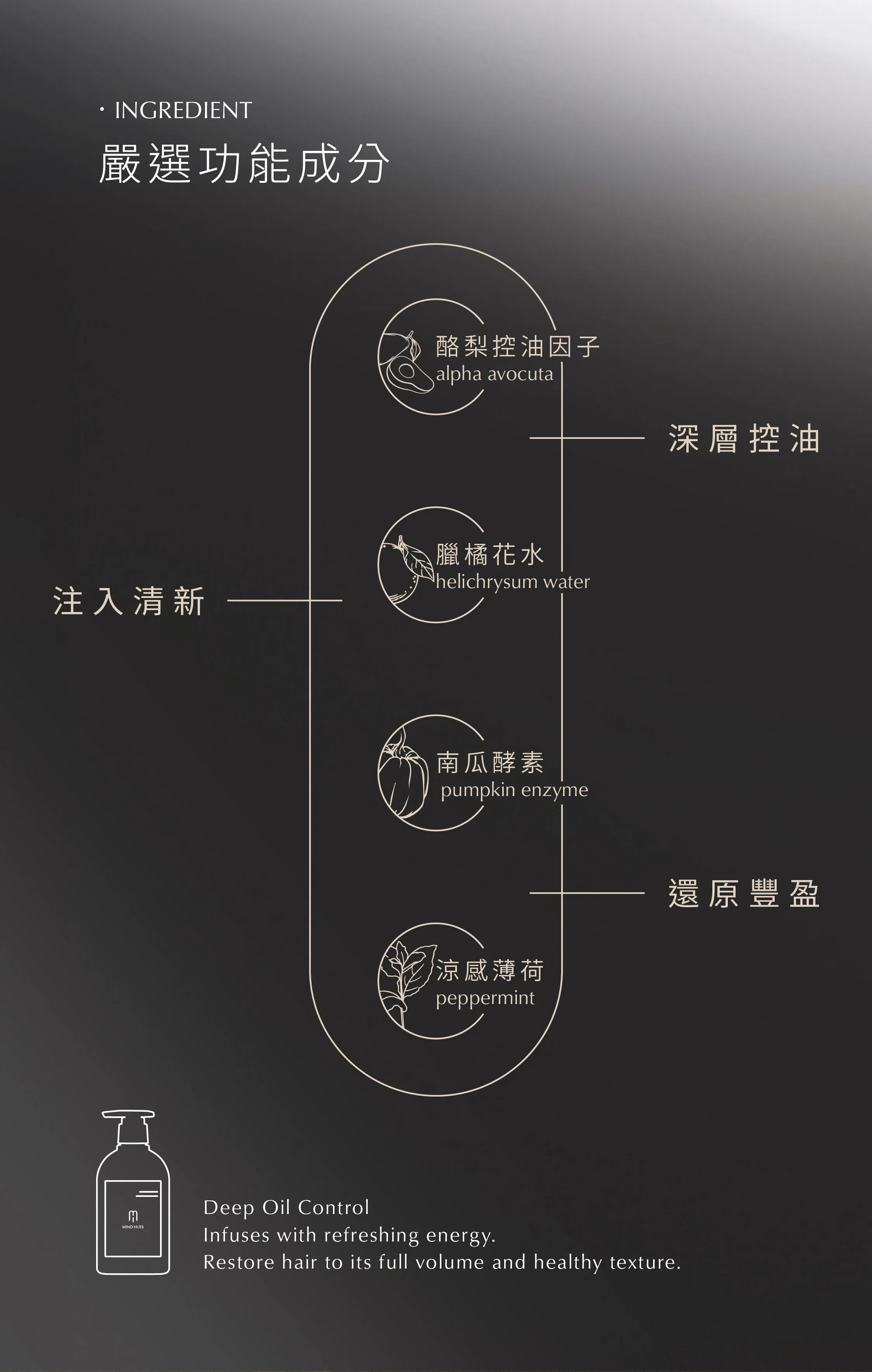 內含酪梨控油因子、涼感薄荷等成分,可深層清潔頭皮髒污、延緩出油,髮根蓬鬆輕盈。