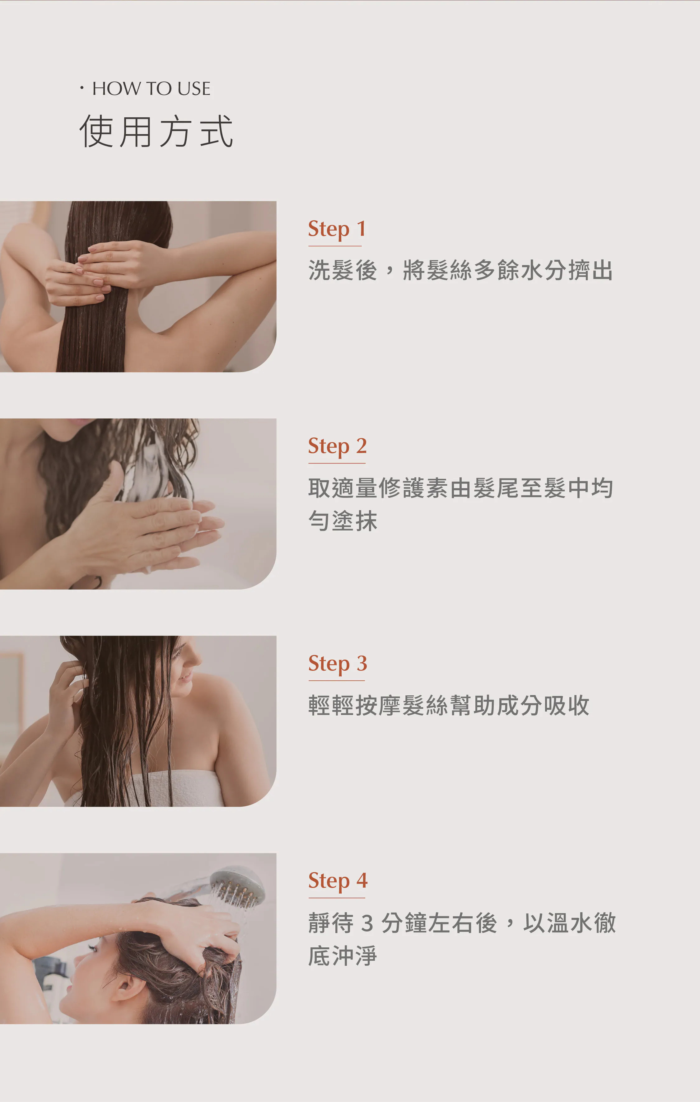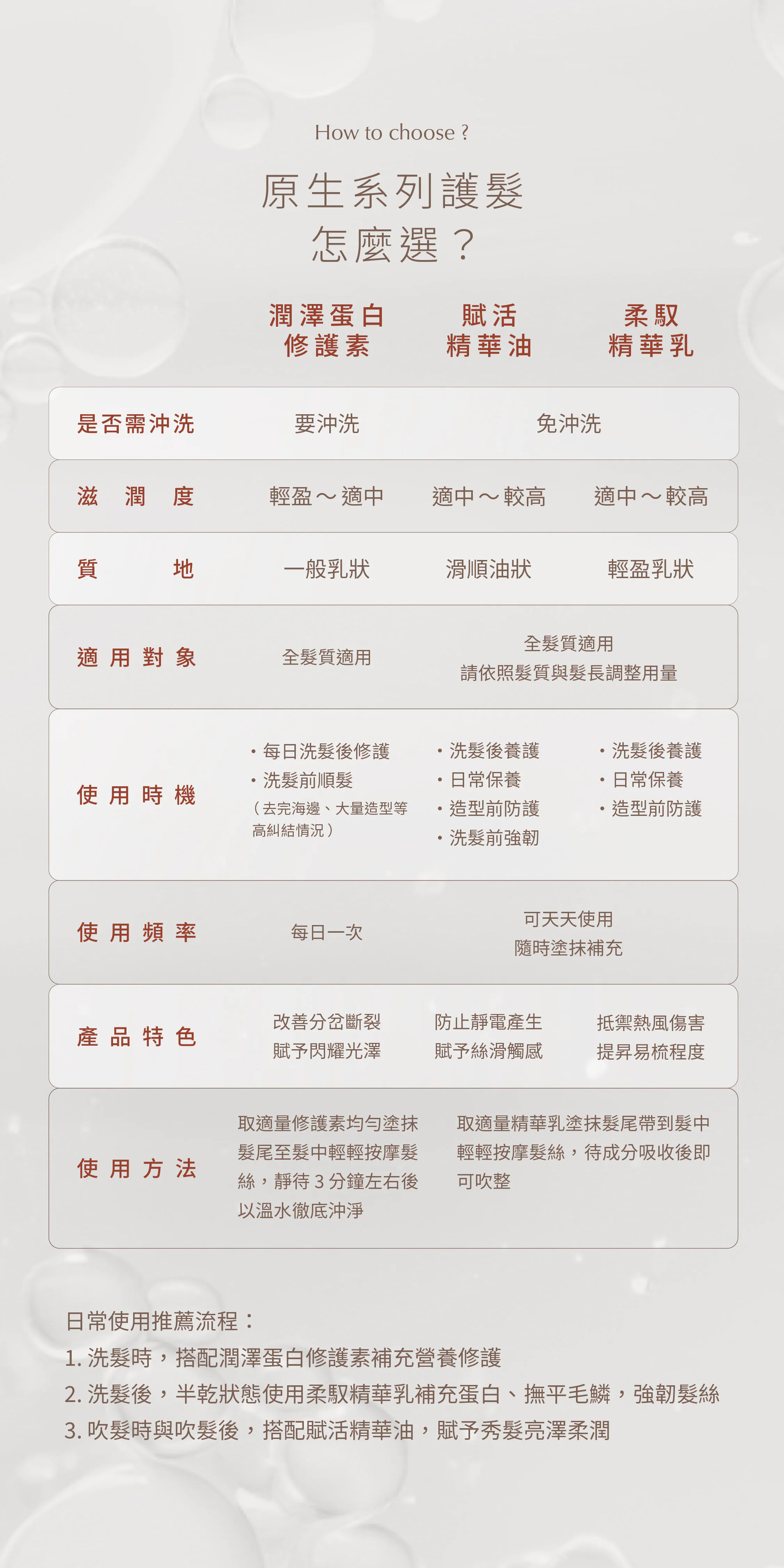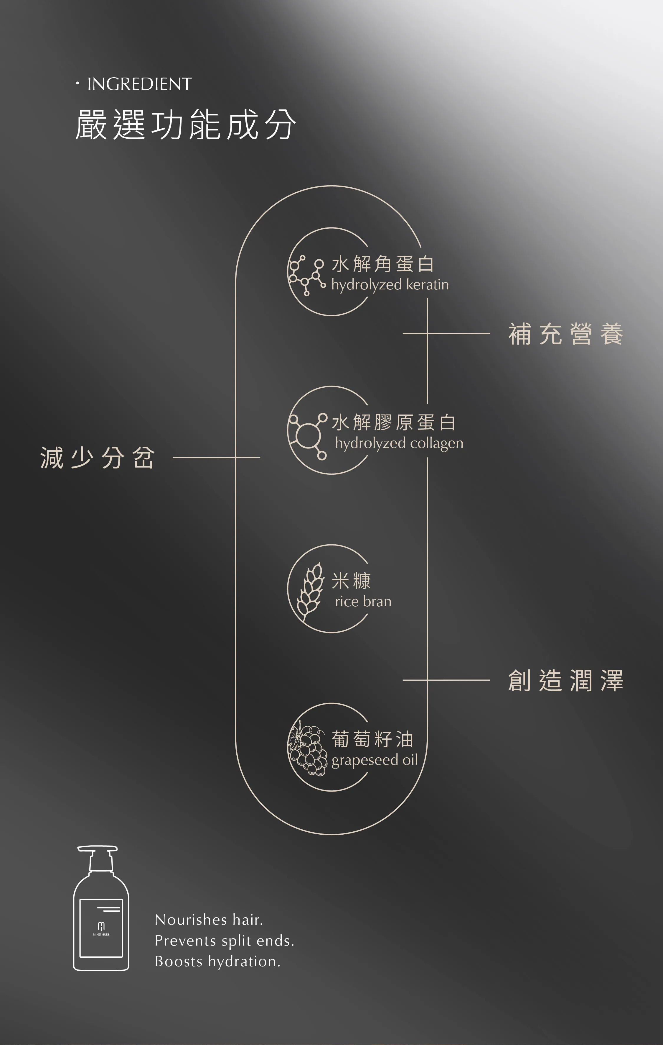 針對分岔、斷裂髮質設計。萃取AQUAXYL等三大專利修護成分及水解膠原蛋白,可改善分岔等受損狀況,給予髮絲柔順光澤感。
