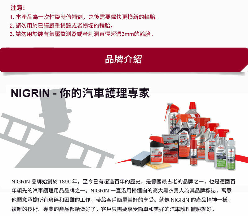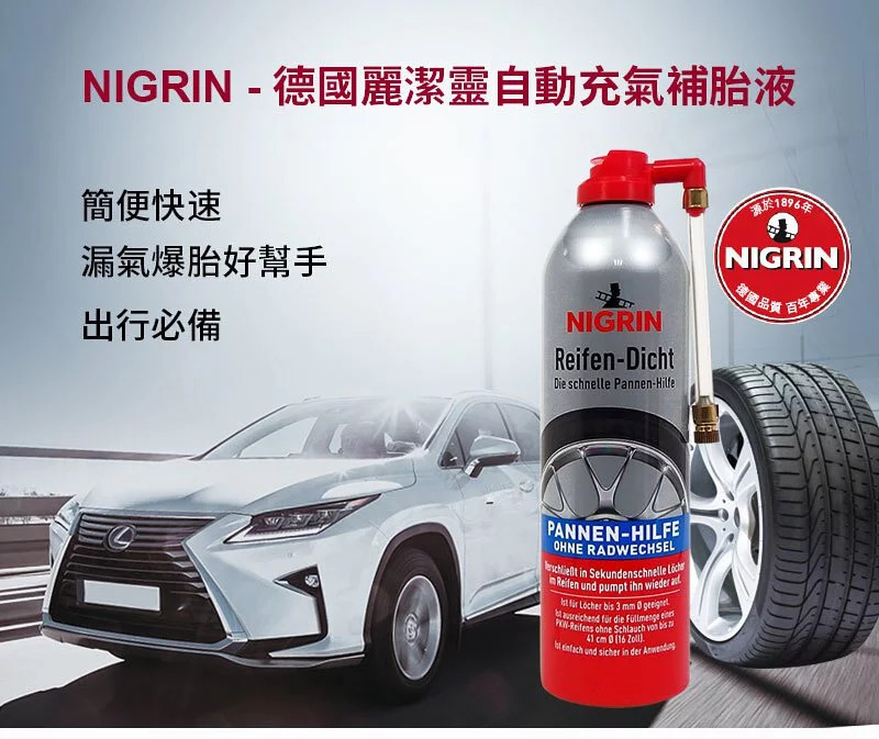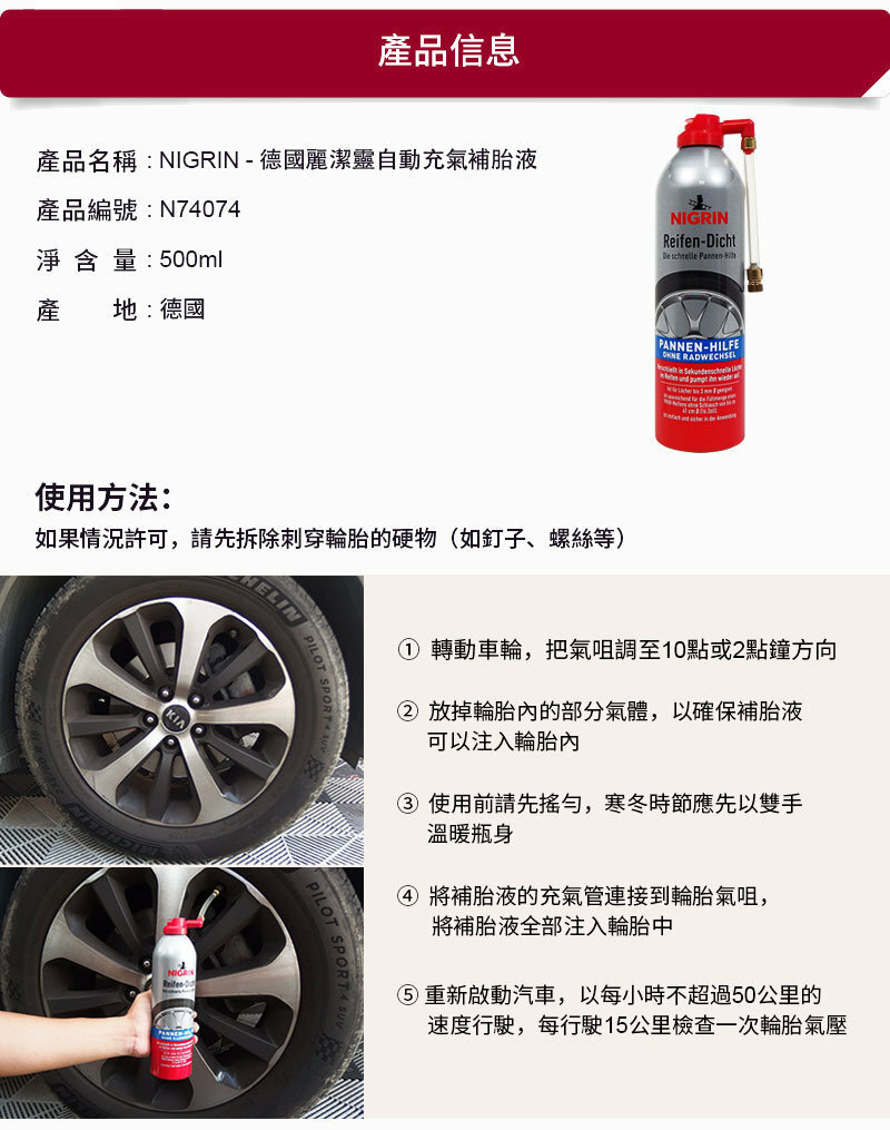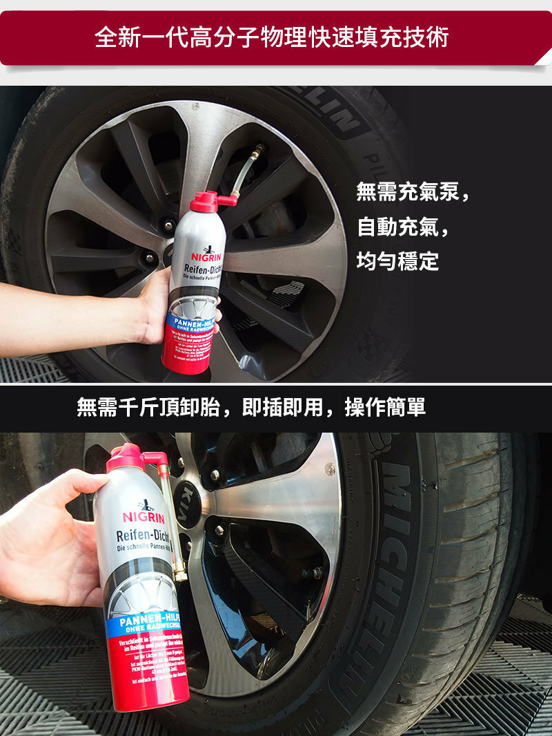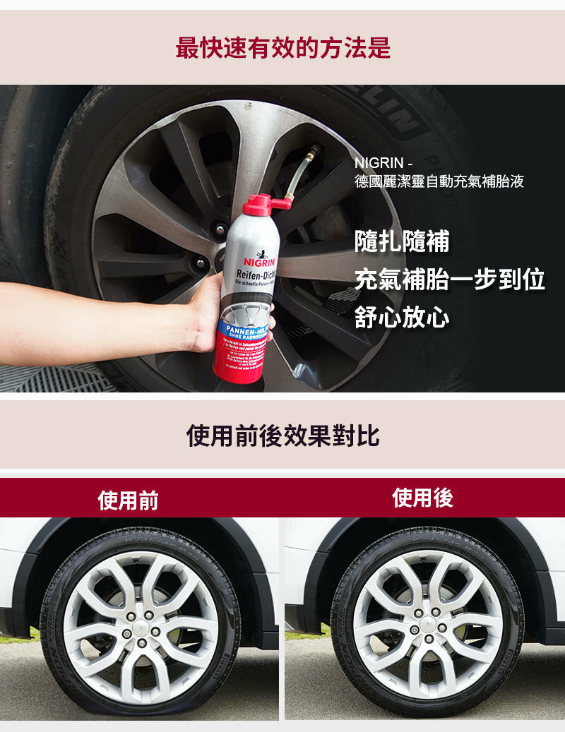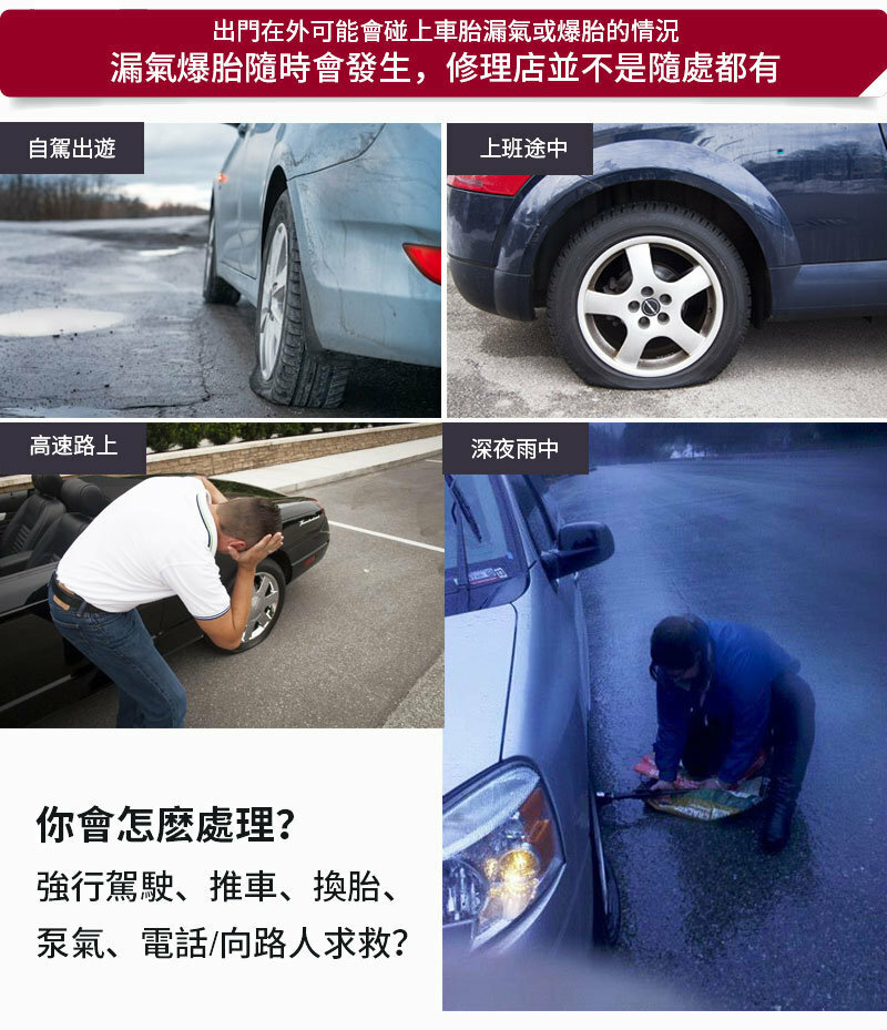 輪胎漏氣故障的方便好幫手,無需更換輪胎,使用本產品即可恢復輪胎原狀