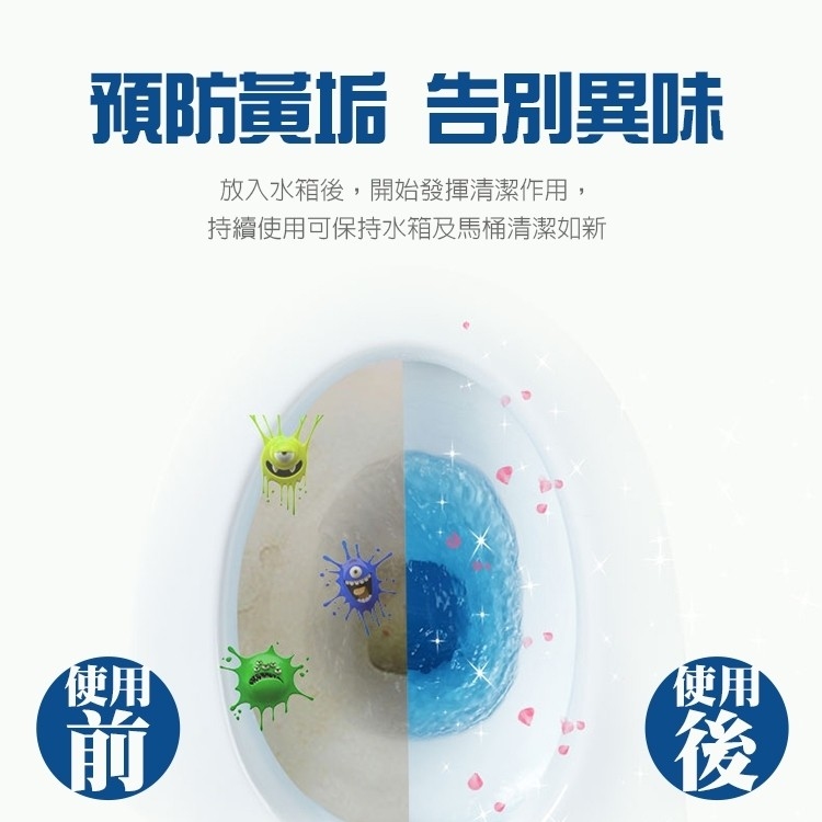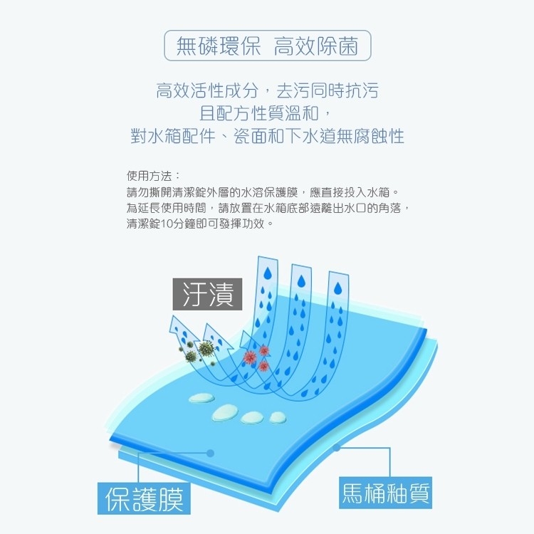 有高效潔淨因子,清潔抑菌方便不沾手,去污同時抗汙, 持久有效300次沖水,無磷配方性質溫和, 對水箱配件及瓷面和下水道無腐蝕性。