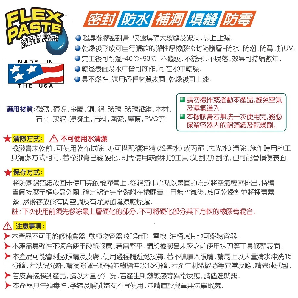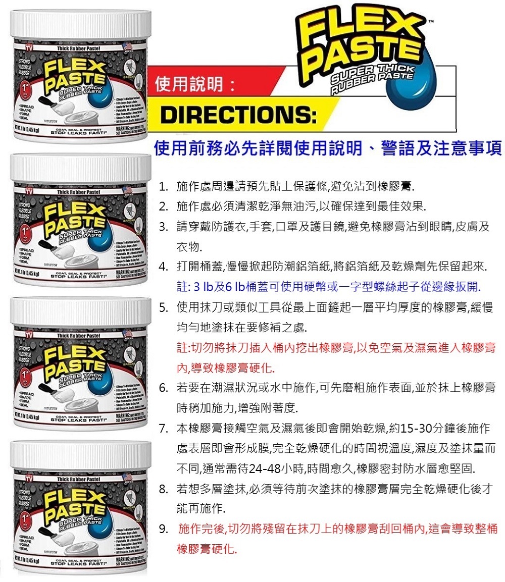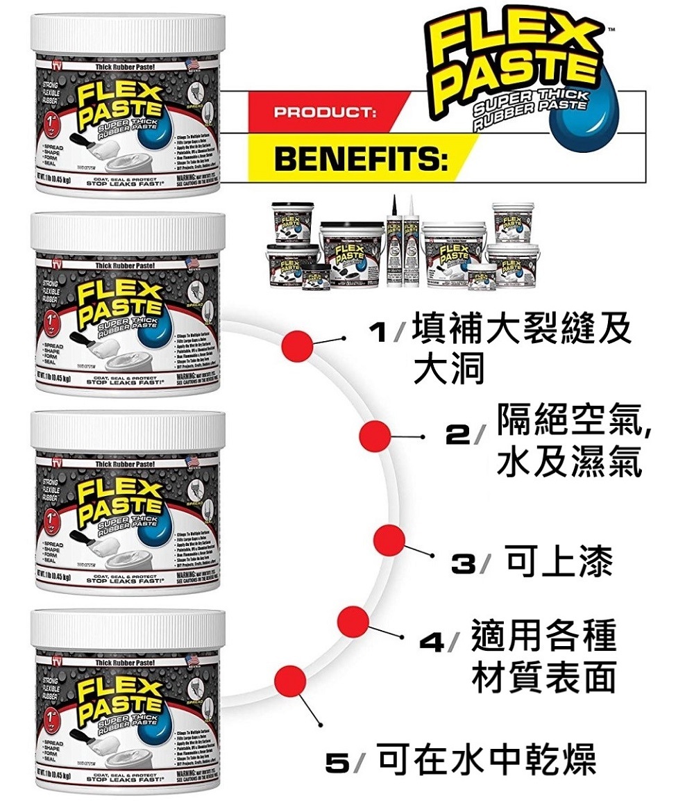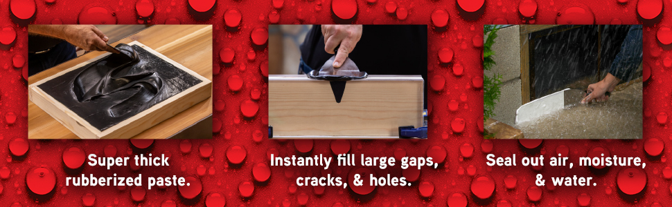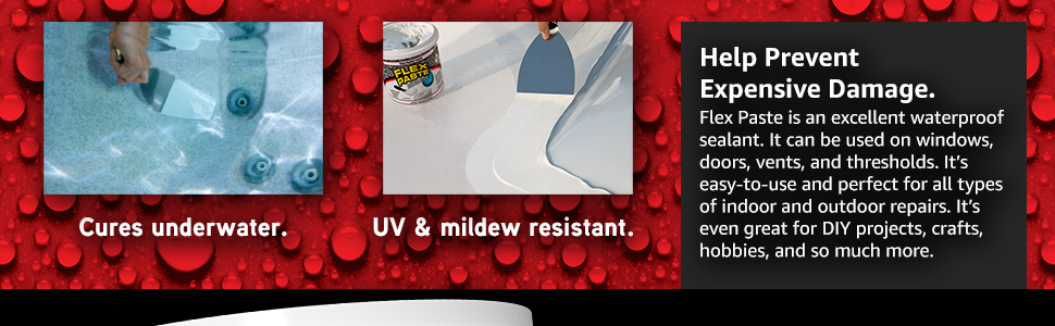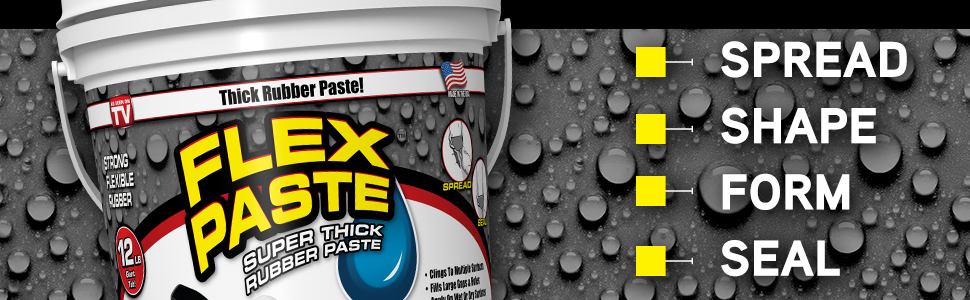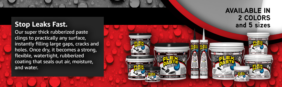 Flex Paste is a super thick rubberized paste that clings to the surface and instantly fills large gaps, cracks and holes. Once dry, Flex Paste turns into a strong, flexible, watertight, rubberized coating that seals out air, water and moisture on a variety of surfaces and objects.