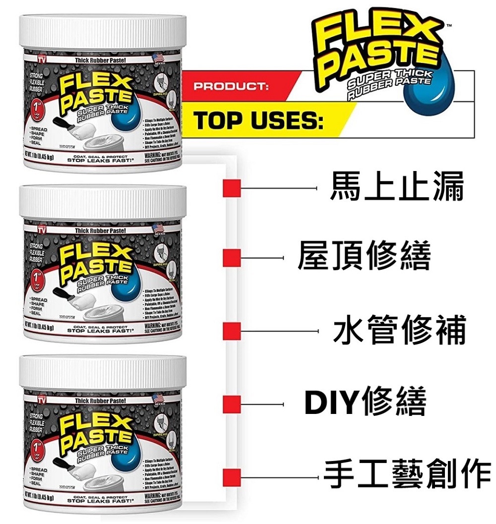 Flex Paste is perfect for DIY, Handyman projects, arts & crafts, hobbies and so much more! Use it to repair your roof, winterize your home, plumbing repairs, to seal cracks, automotive or marine repairs, pool and spa repairs, and so much more.