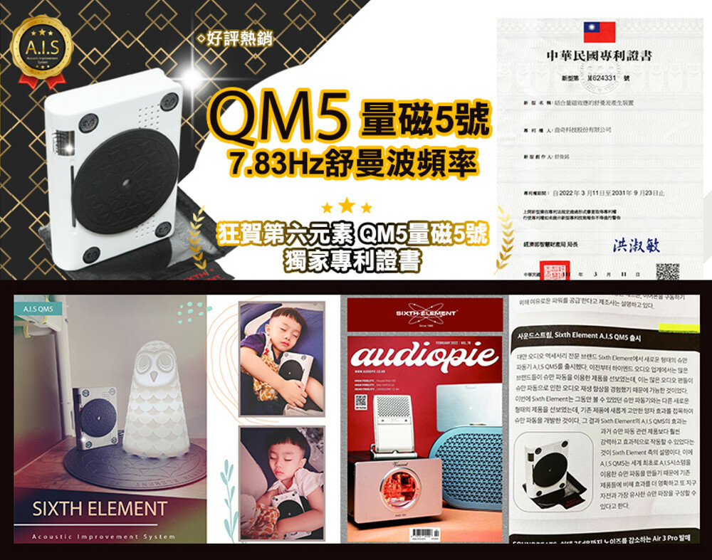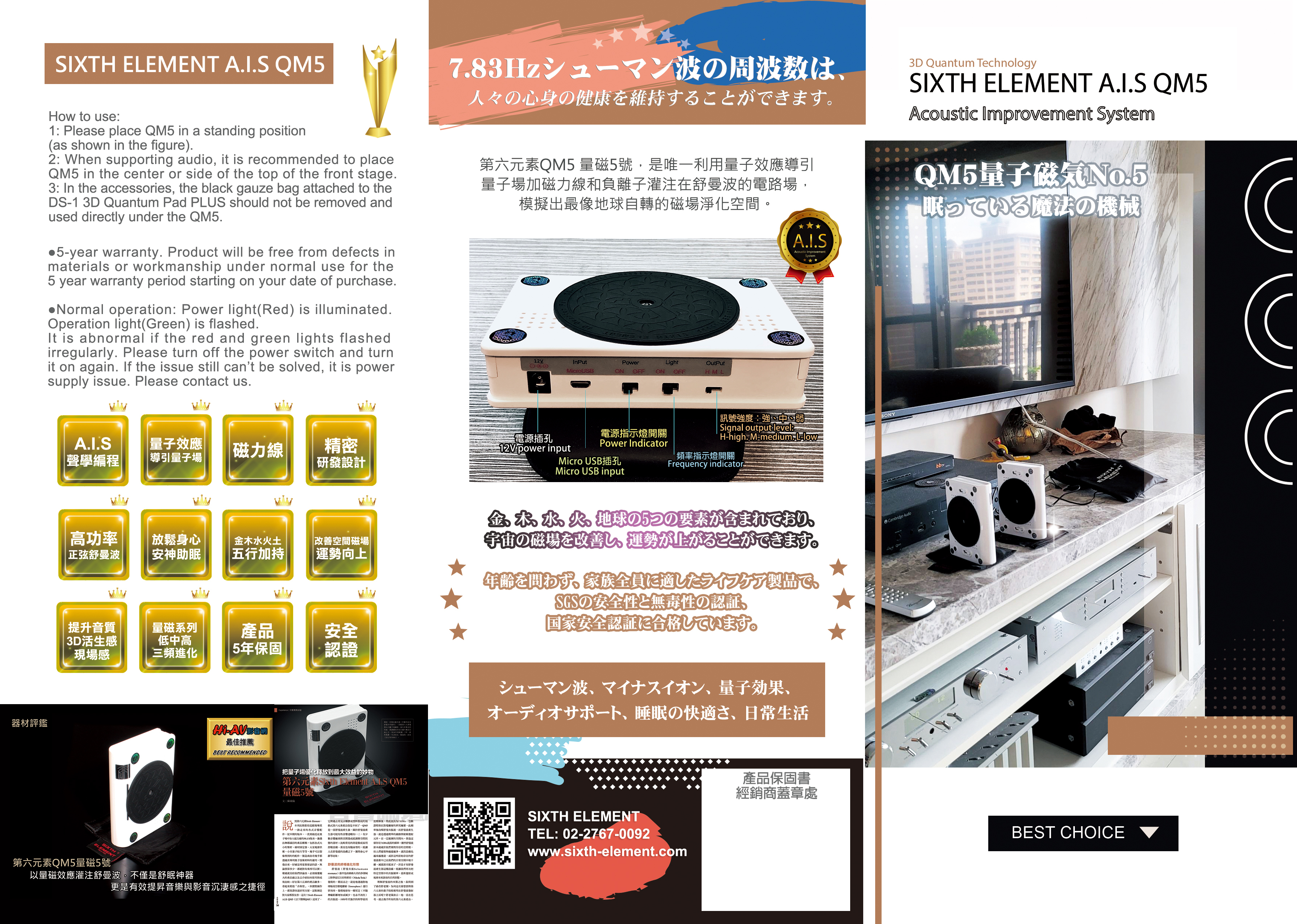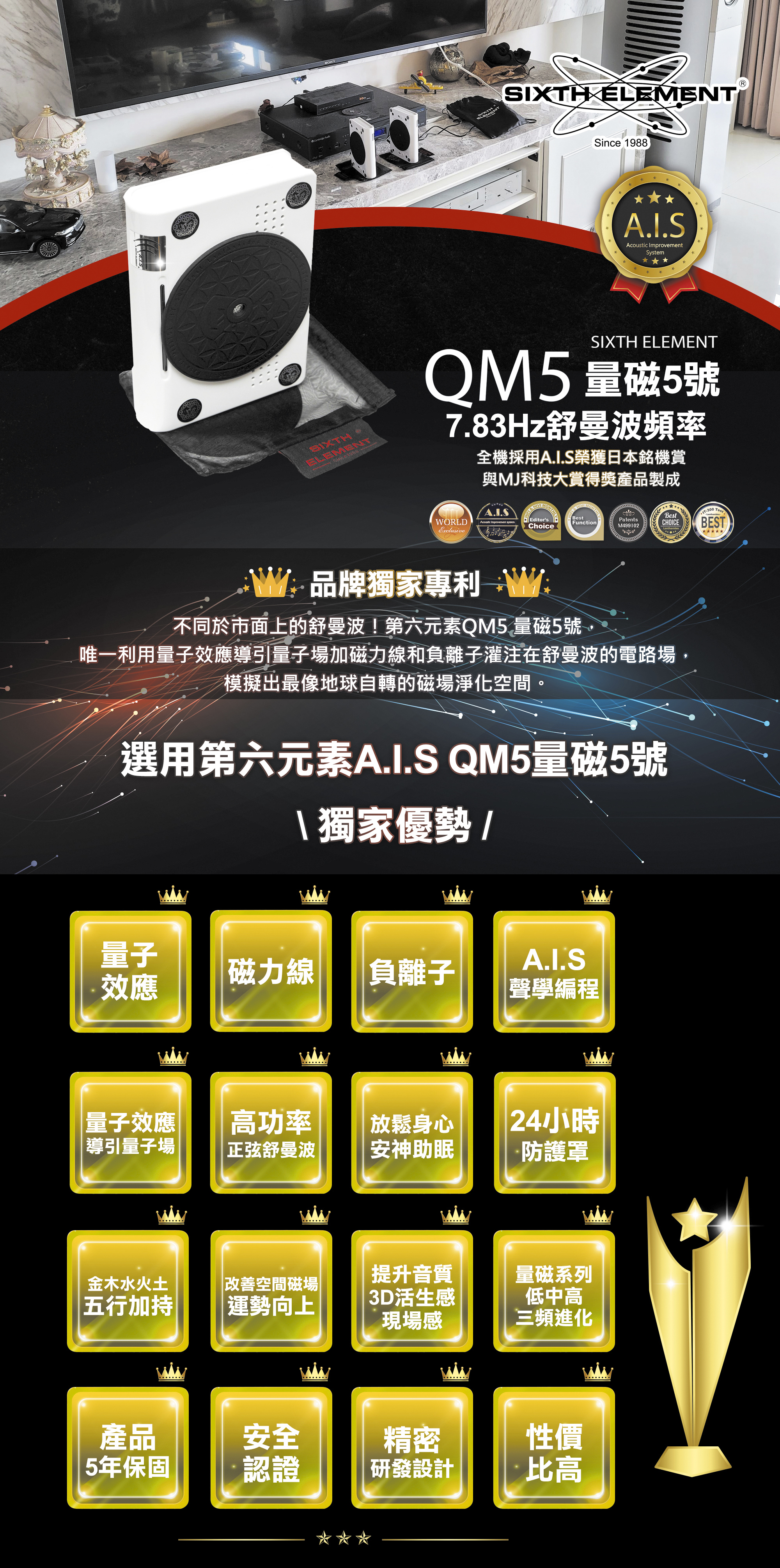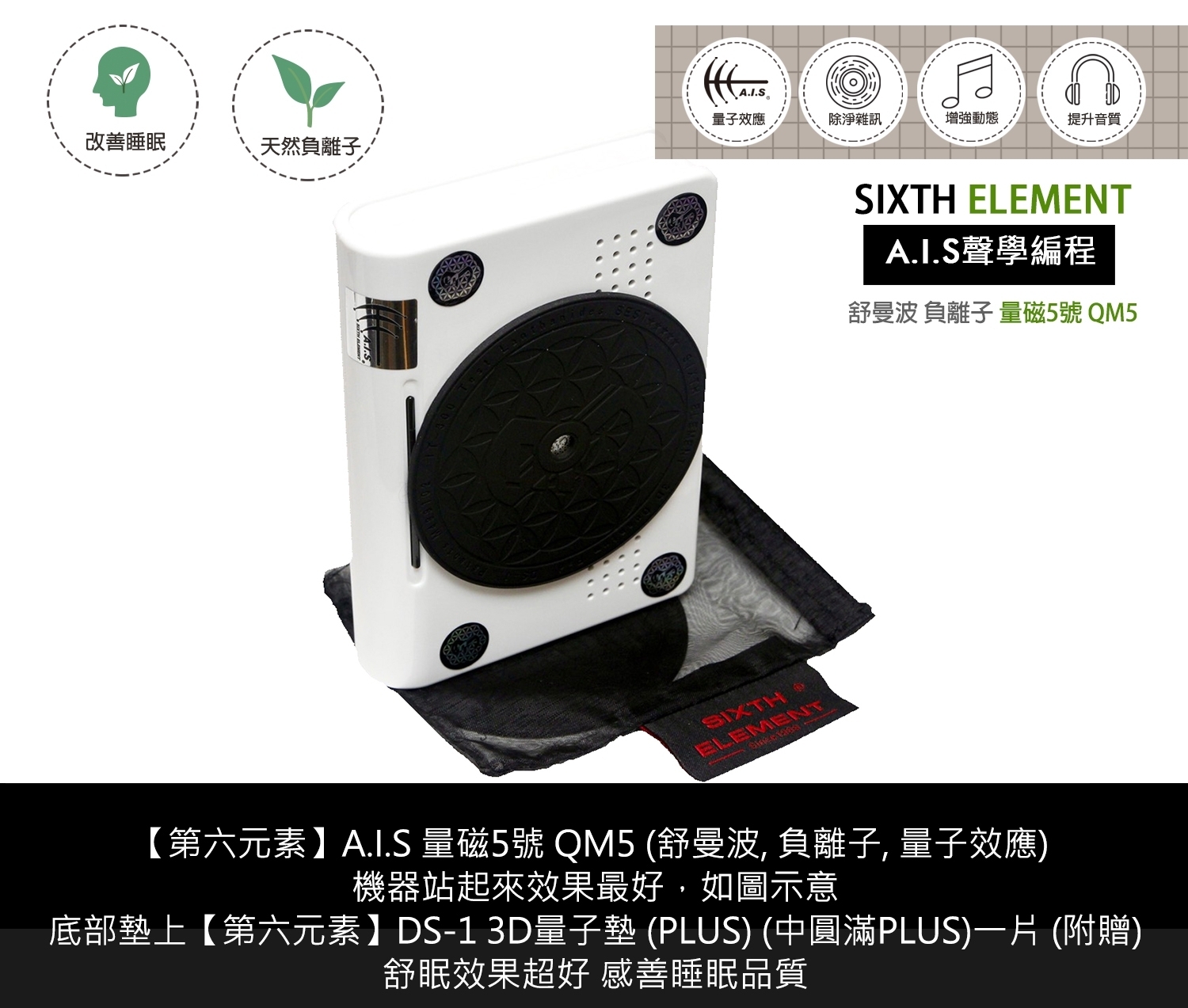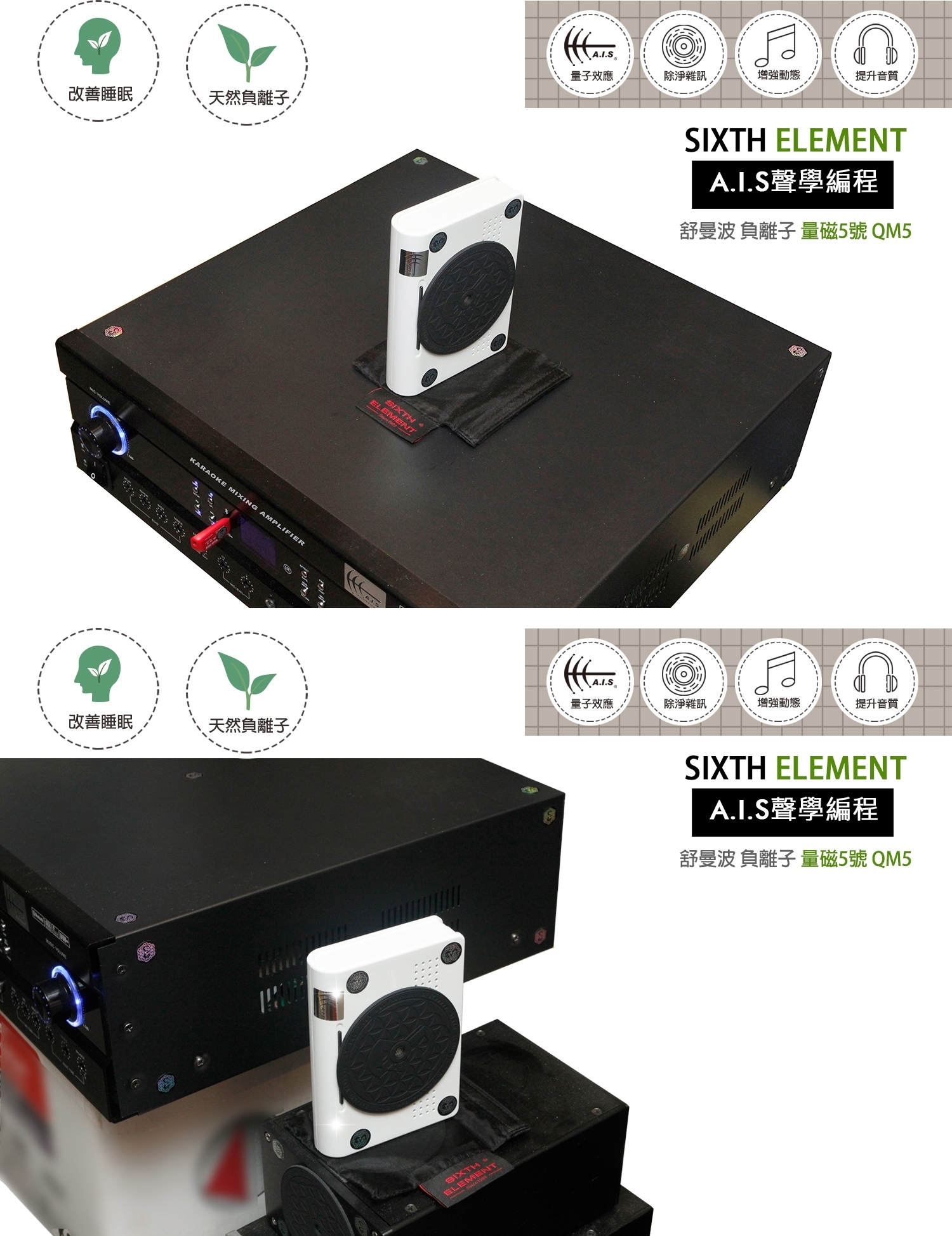 SIXTH ELEMENT A.I.S QM5量磁5號 為世界首創A.I.S量磁舒曼波,是唯一利用 A.I.S量子效應導引量子場 加上磁力線和負離子 灌注在舒曼波的電路場,優化穩定舒曼波的效果,模擬出最像地球自轉的磁場。(A.I.S量磁效應:加入鑭系元素Lanthanides和磁粉讓量子效應和磁力線交互作用)