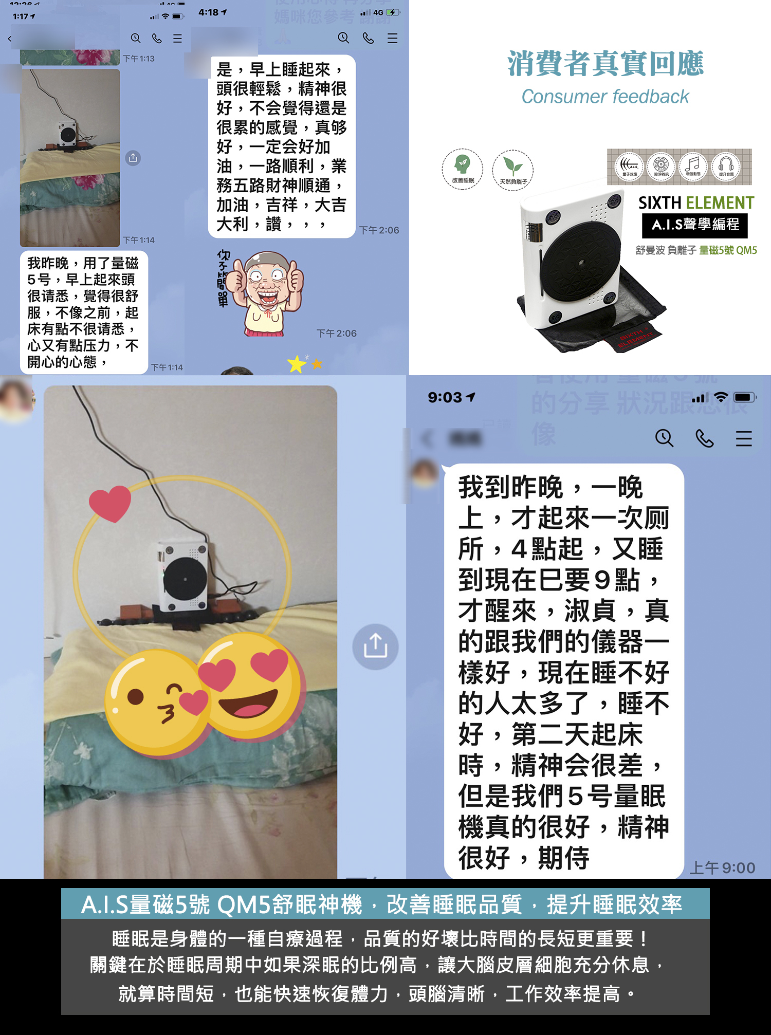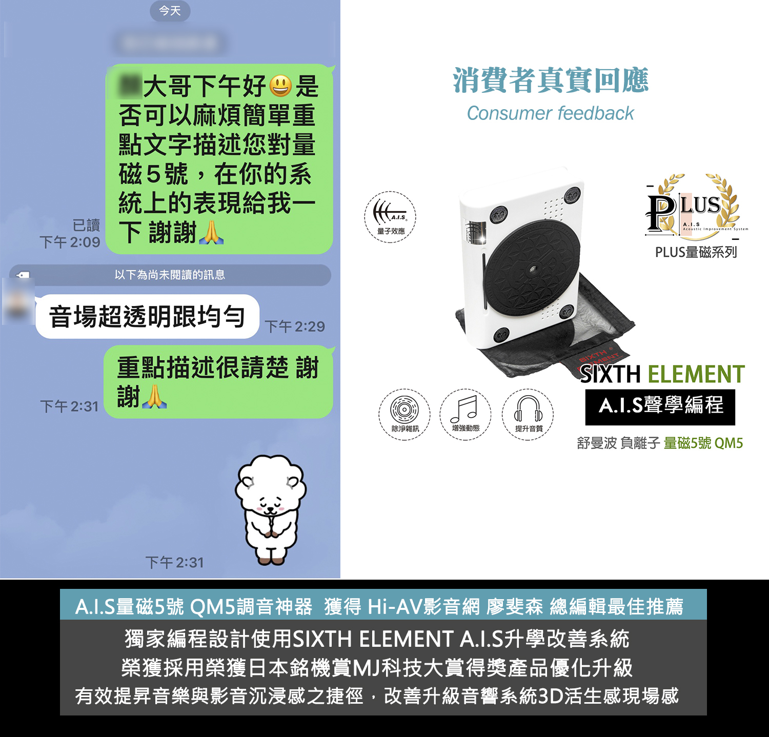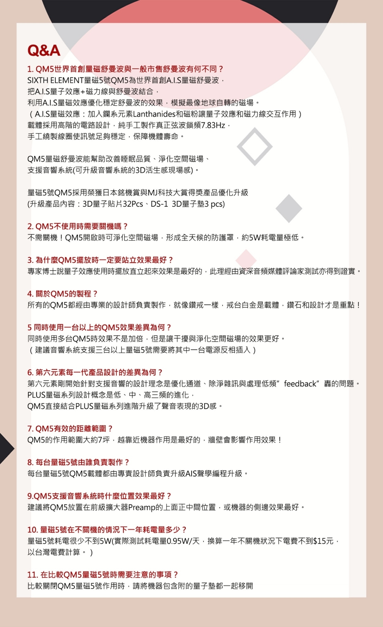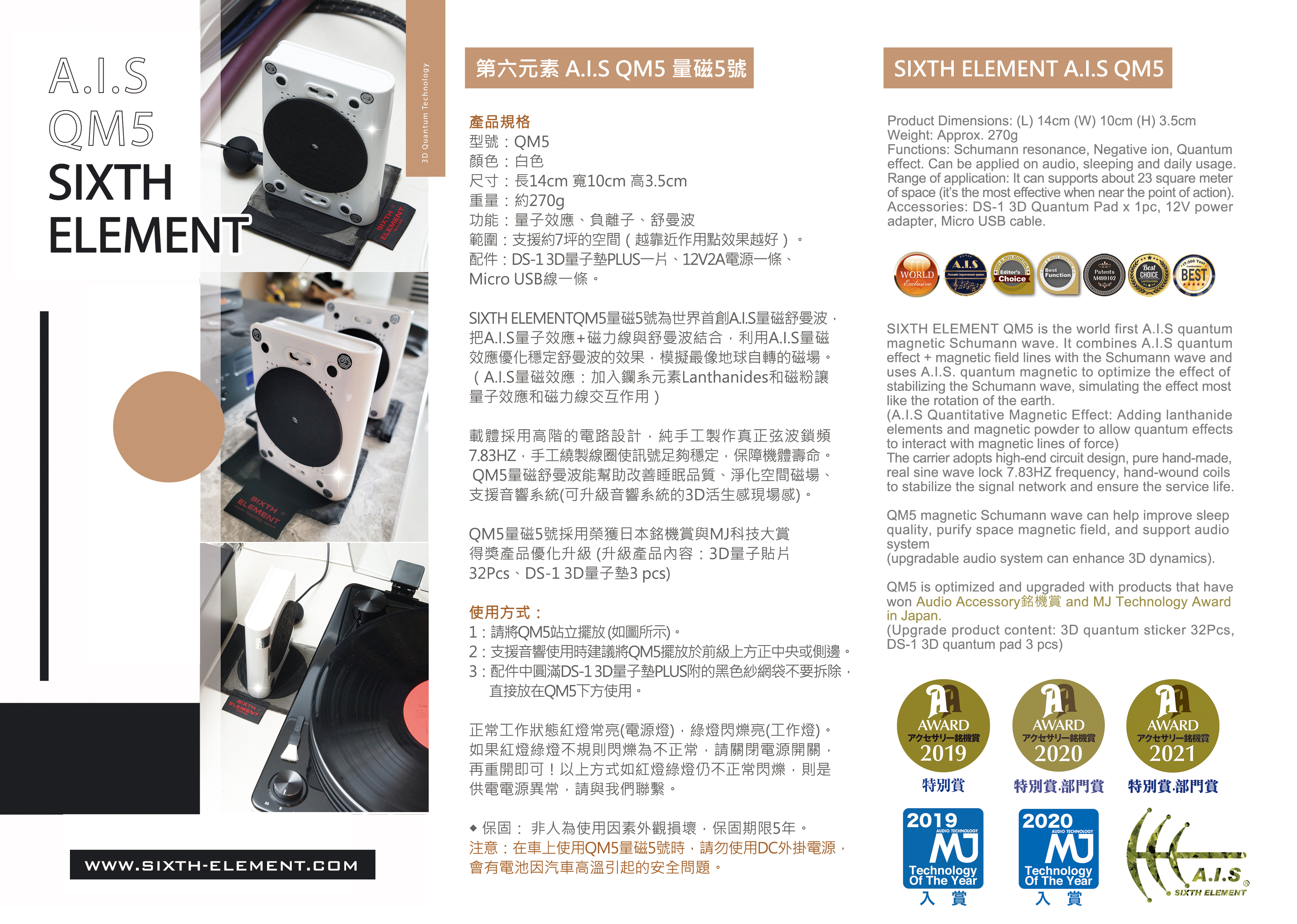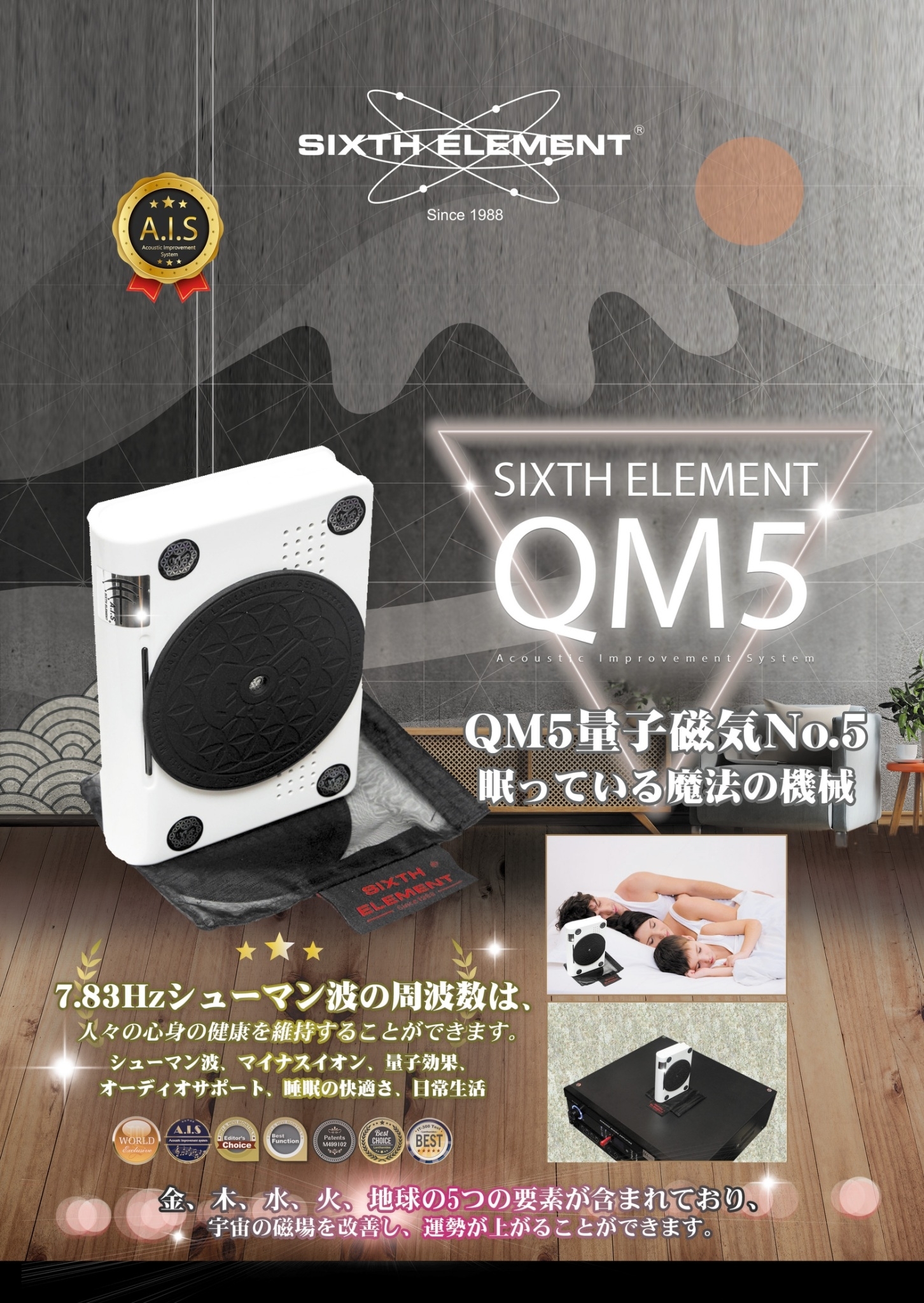 SIXTH ELEMENT A.I.S QM5量磁5號 為世界首創A.I.S量磁舒曼波,是唯一利用 A.I.S量子效應導引量子場 加上磁力線和負離子 灌注在舒曼波的電路場,優化穩定舒曼波的效果,模擬出最像地球自轉的磁場。(A.I.S量磁效應:加入鑭系元素Lanthanides和磁粉讓量子效應和磁力線交互作用)