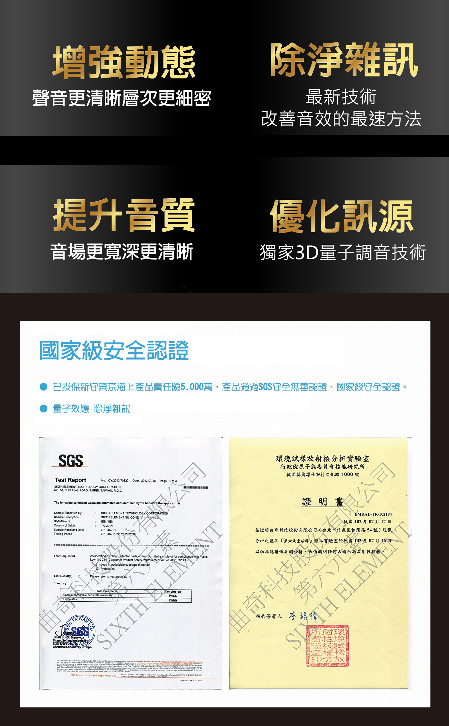 ( 第六元素 QM5 (專利 M 624331 號)、第六元素 量子貼片 (專利 M 548422號)、第六元素 量子墊 (專利 M 499102 號) )