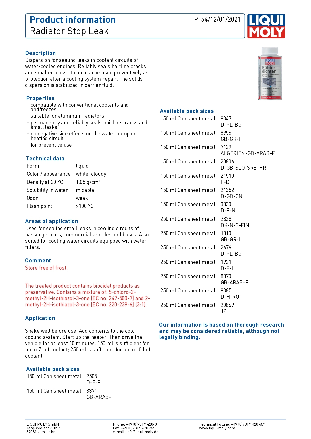 150 ml of the Liqui Moly Radiator Stop-Leak (3330) are suitable for 7 liters of coolant. Compatible with all conventional cooling lubricants.