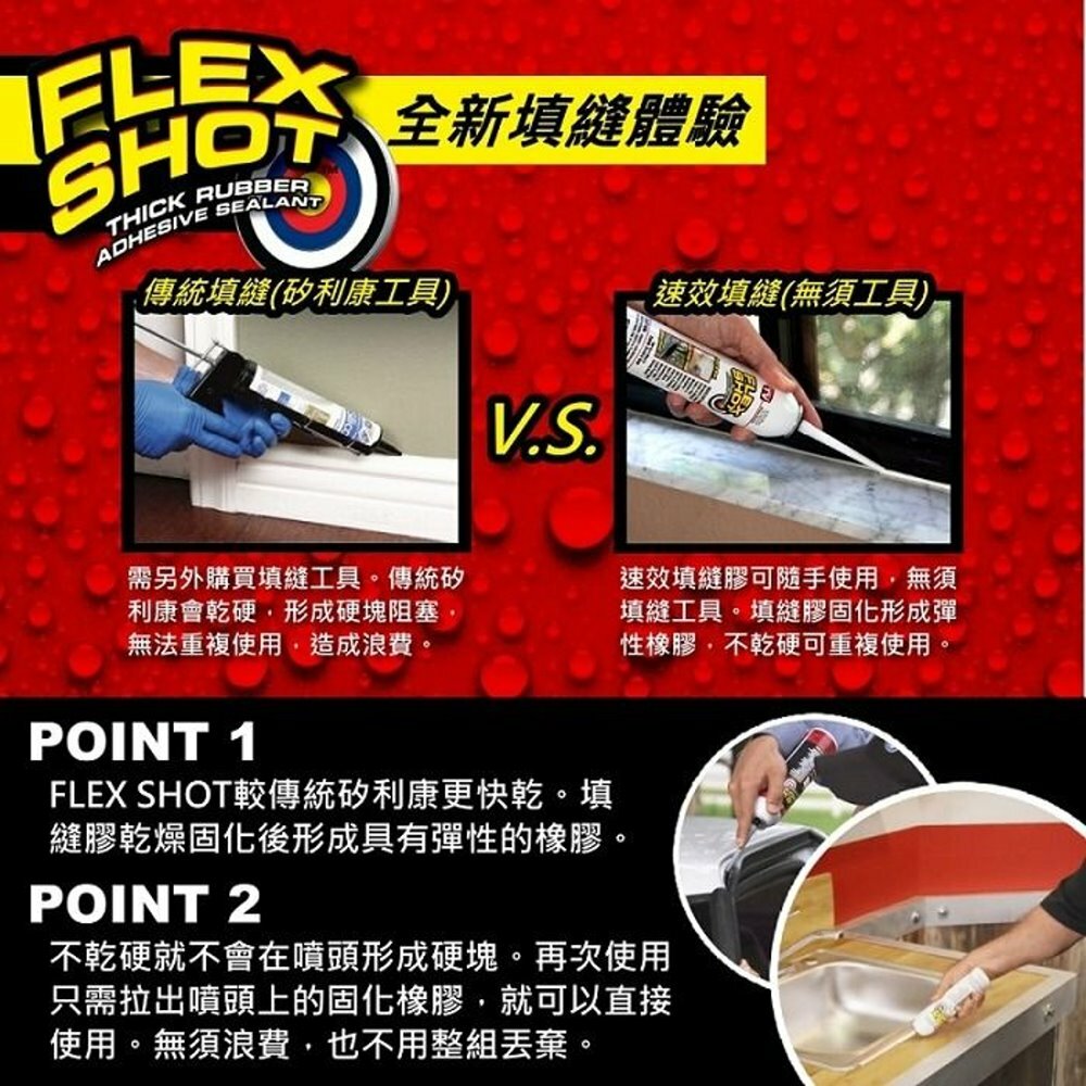 A: Flex Shot™ dries much faster than many other caulks and sealants. Flex Shot® forms a tack- free skin in 20 minutes. Length of full cure time depends upon factors such as; temperature and humidity. It will become rubbery solid in about 24 hours.