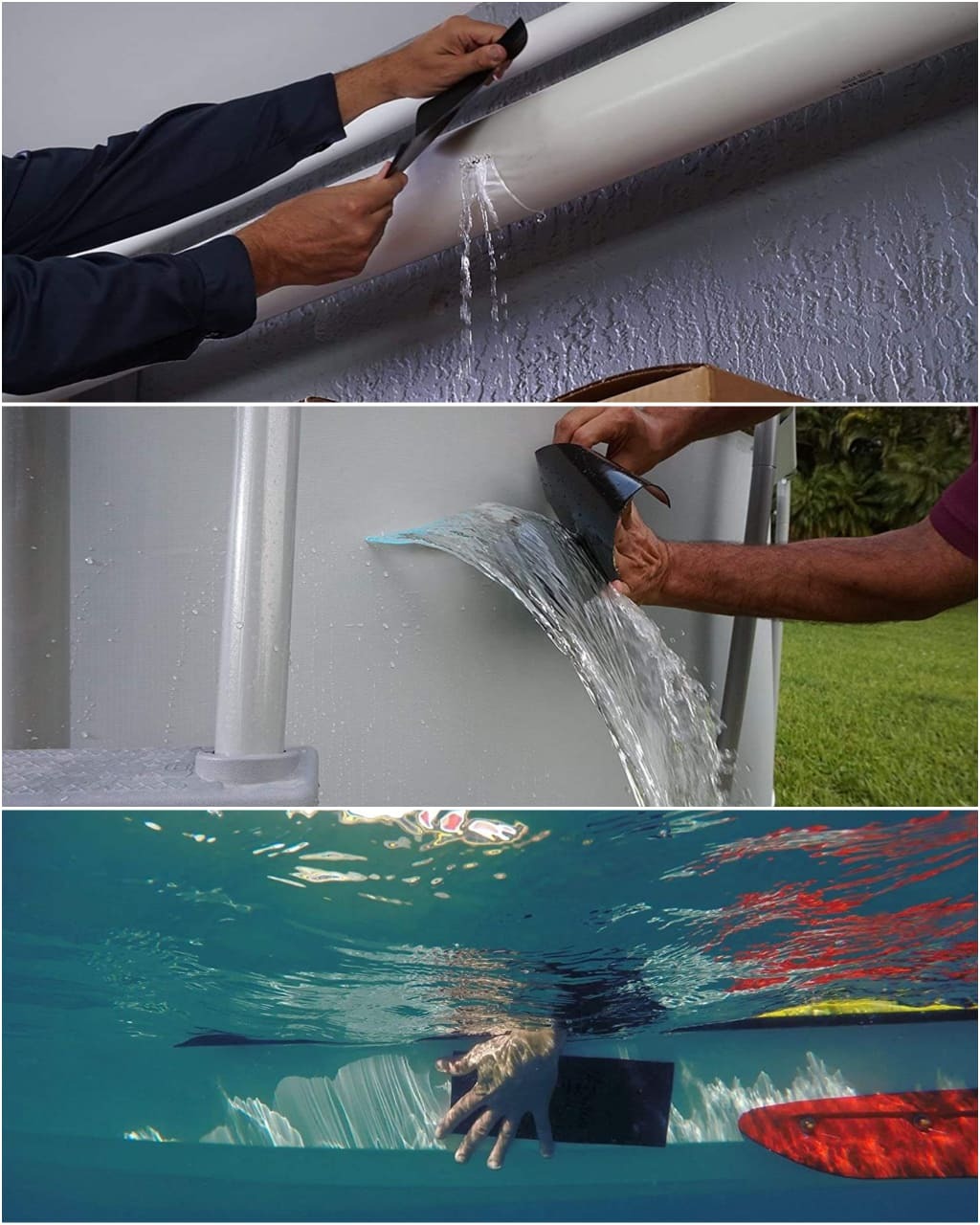 A: Both! Flex Tape forms a super strong bond with itself, so if you’re patching a pool it’s best to first apply Flex Tape to the interior side of the pool wall and then place a second piece of Flex Tape to the exterior. Remember to cut your Flex Tape larger than the area of the leak. You do not need to drain the pool prior to applying it. Flex Tape is a temporary, emergency repair and is not meant to be a permanent fix.