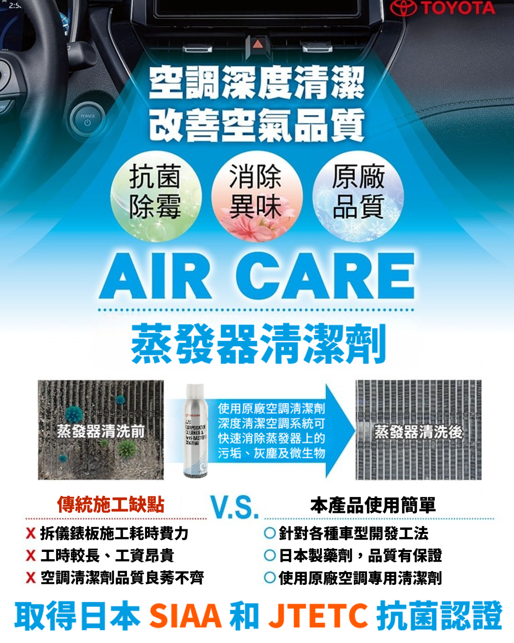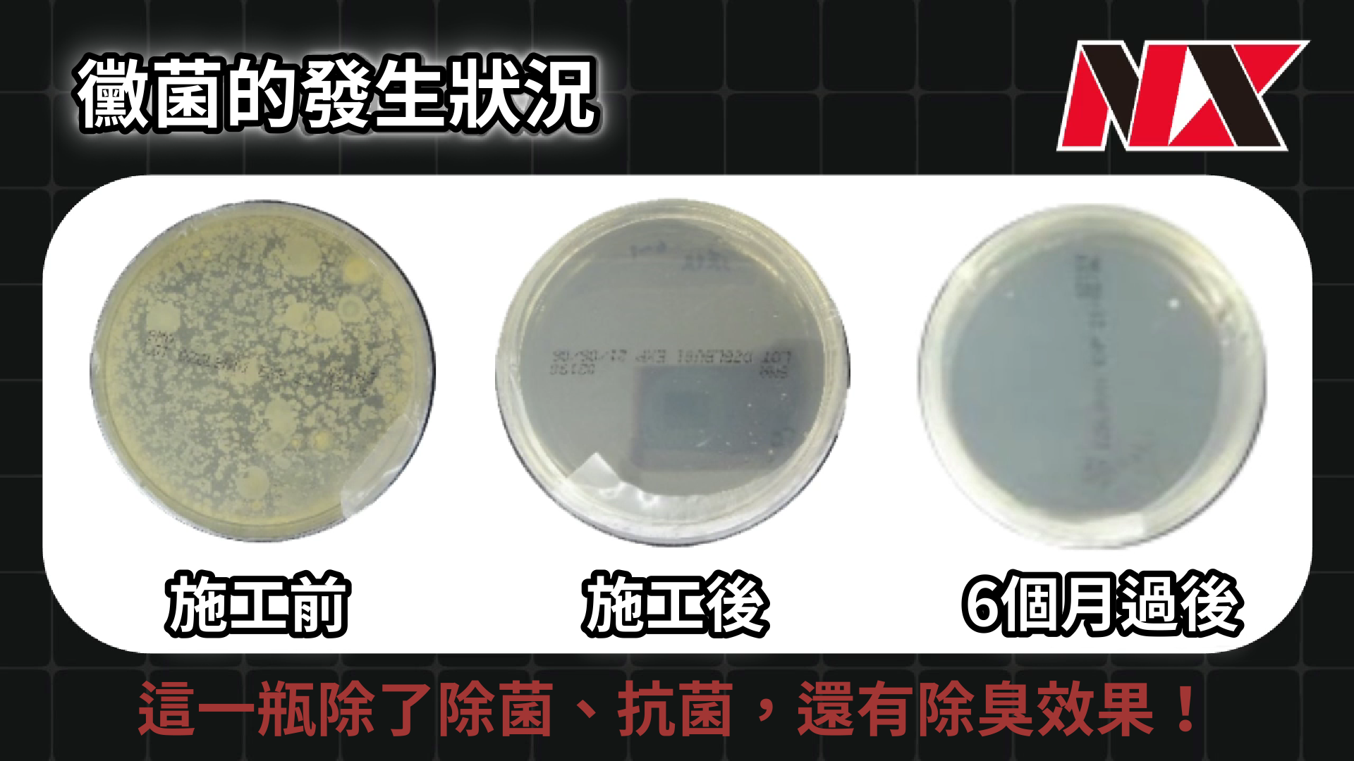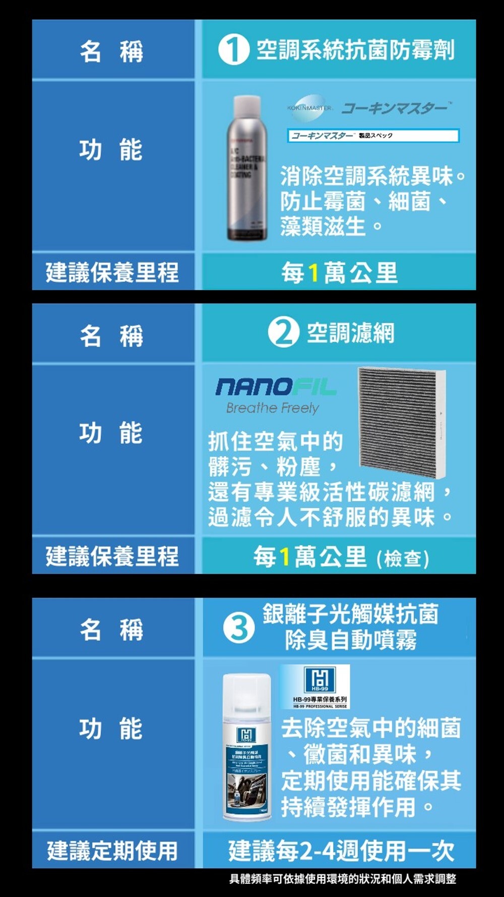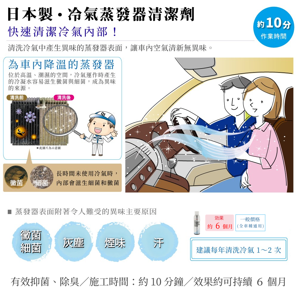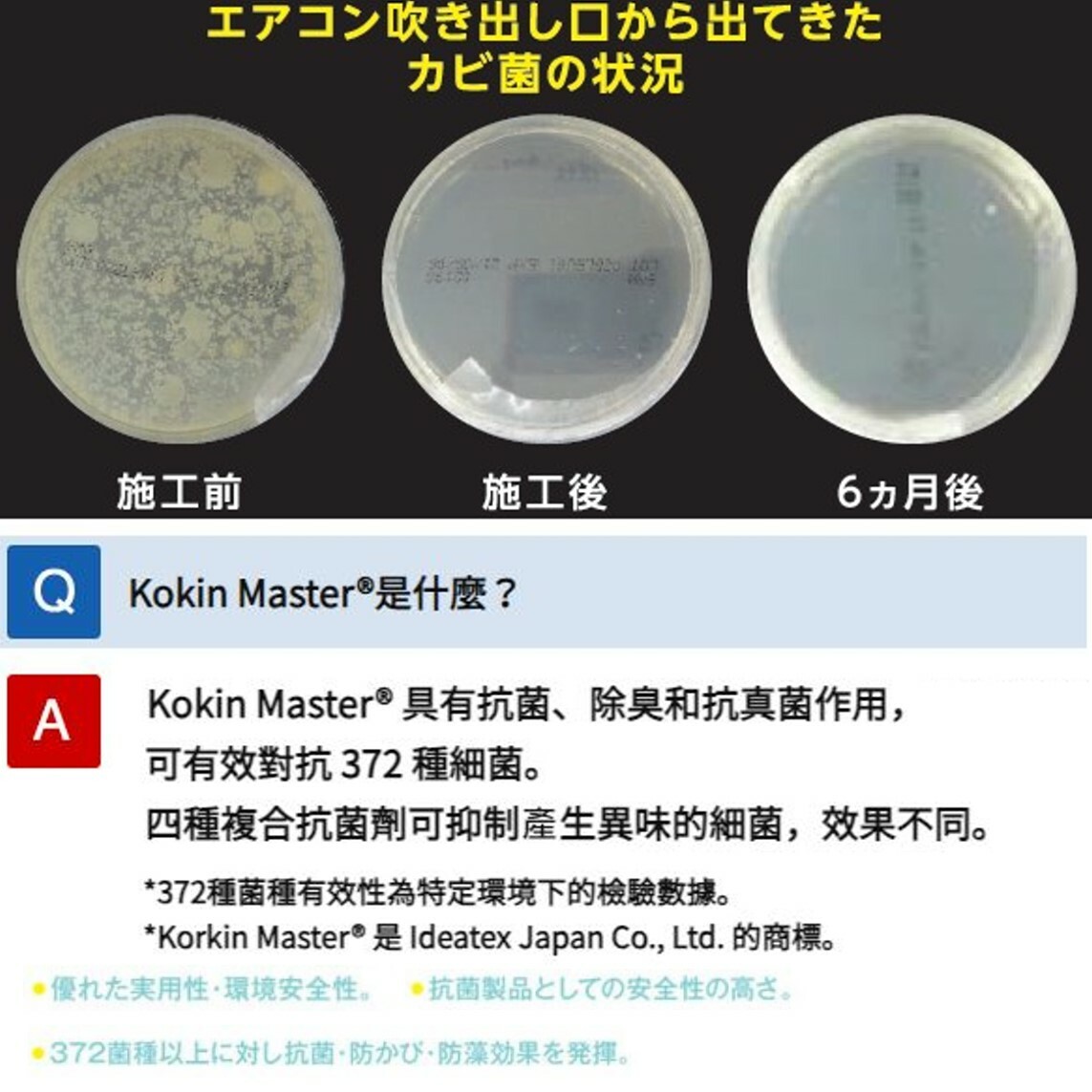 可快速消除蒸發器上的污垢、灰塵及微生物,提昇車內冷房效率與品質,採用世界首創 KOKINMASTER® 除臭抑菌配方,在表面形成保護層,延緩污物再次累積,經實驗證明,可對372種類的霉菌、細菌、藻類具有除菌及抗菌防霉效果,保持空調統內部清潔。