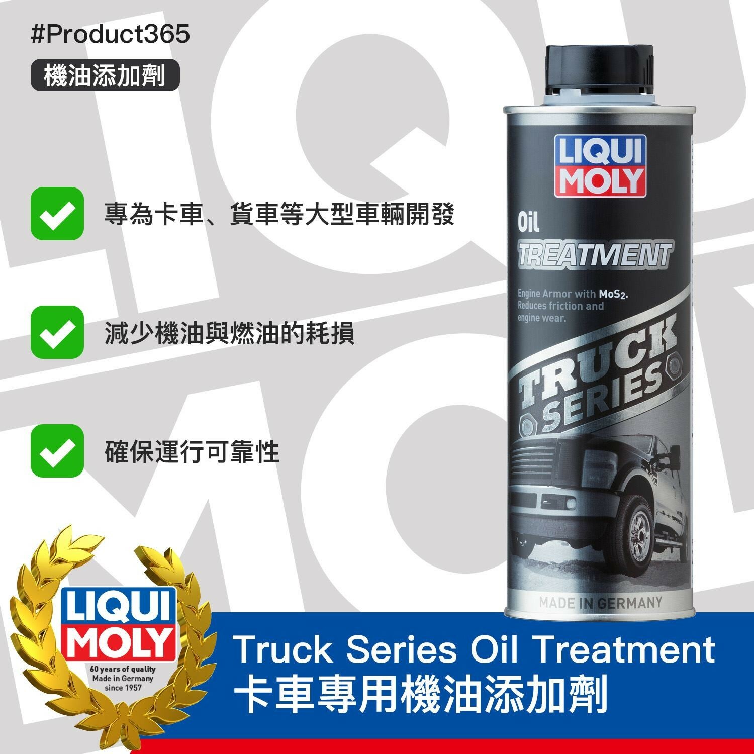 本產品含有二硫化鉬(MoS2),可在引擎內部形成高強度的潤滑薄膜,提供最佳的磨損保護性能,確保運行可靠性。可降低引擎的噪音並減少機油以及燃油的消耗。