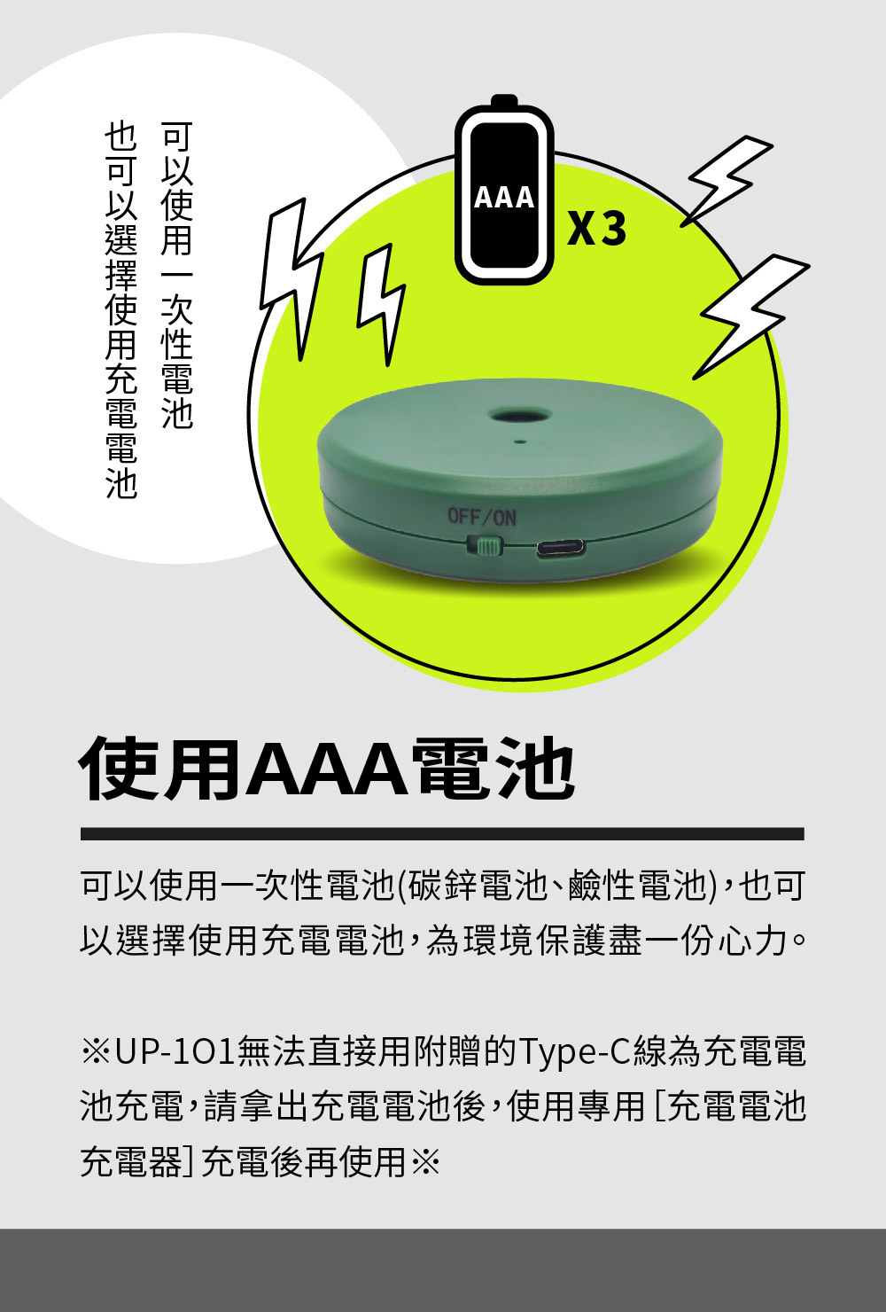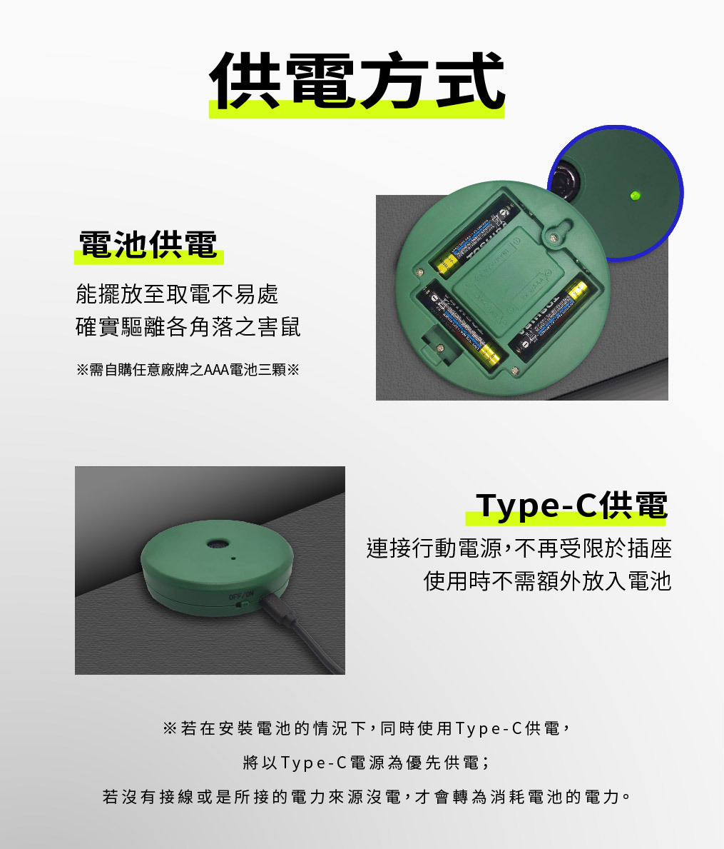 依環境需求,自由選擇供電方式 (電池 / Type-C)