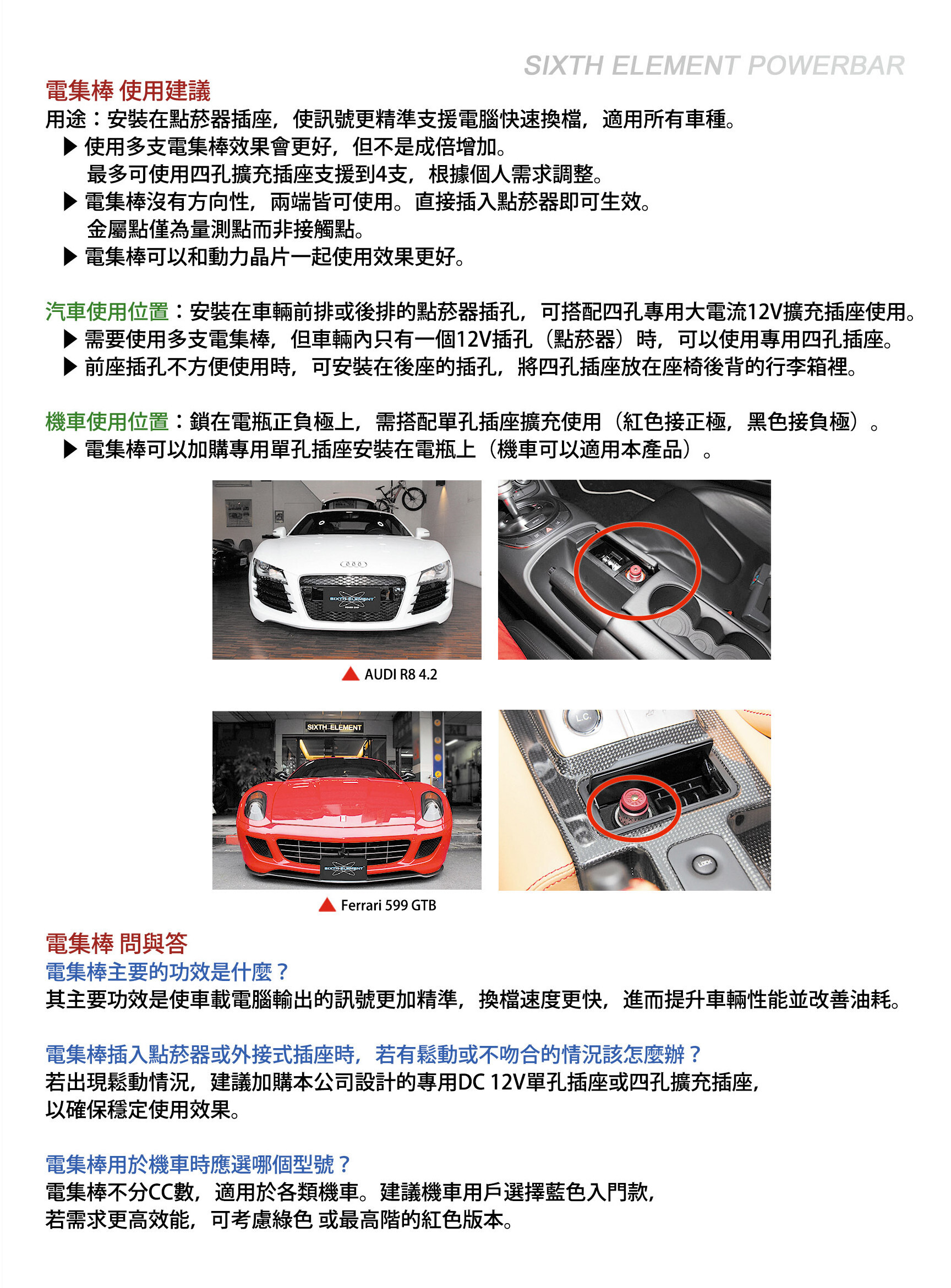 1A:第六元素電集棒沒有分方向性,兩頭都可以使用,是本公司設計的專利。兩端的金屬點為產品的量測點,並非接觸點。不需要接觸。電集棒主要對應車子的電腦,讓電腦輸出的訊號更加精準,換檔更快,進而改善您車子的性能,相對讓馬力提升,油耗減少。