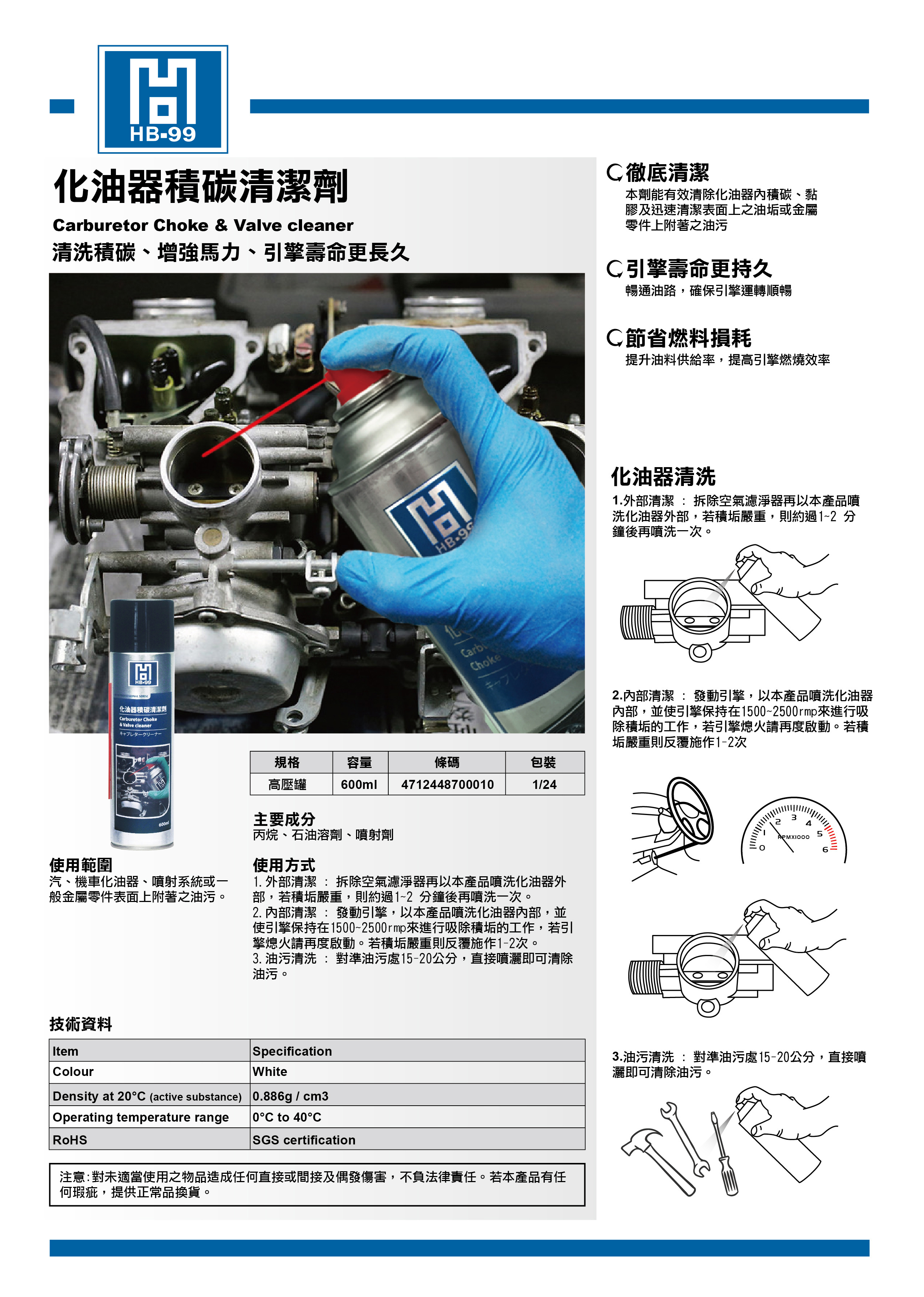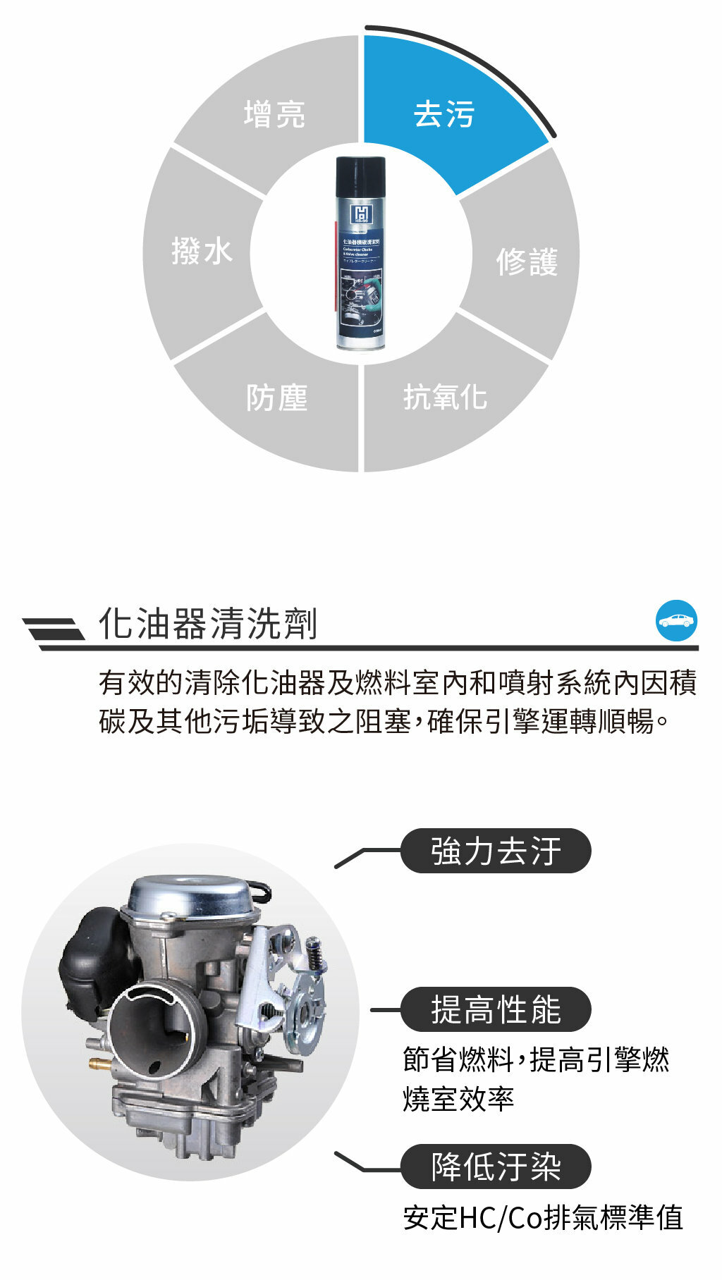 有效的清除化油器及燃料室內和噴射系統內因積碳及其他污垢導致之阻塞,確保引擎運轉順暢。