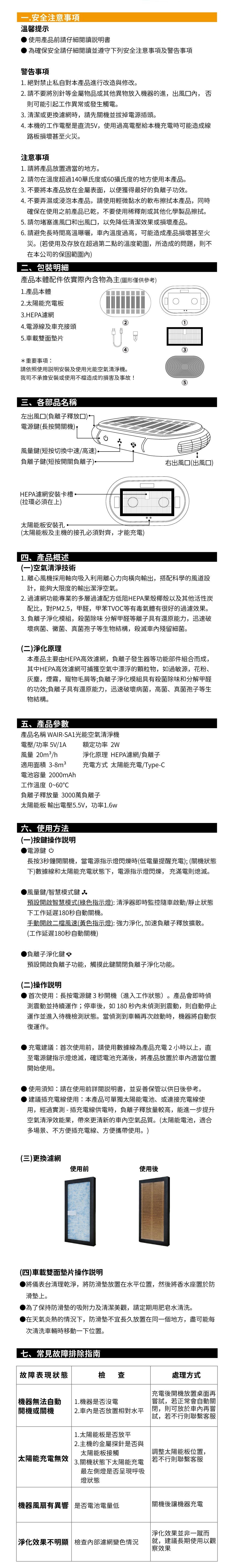 產品名稱 WAIR-SA1淨化王-光能空氣清淨機